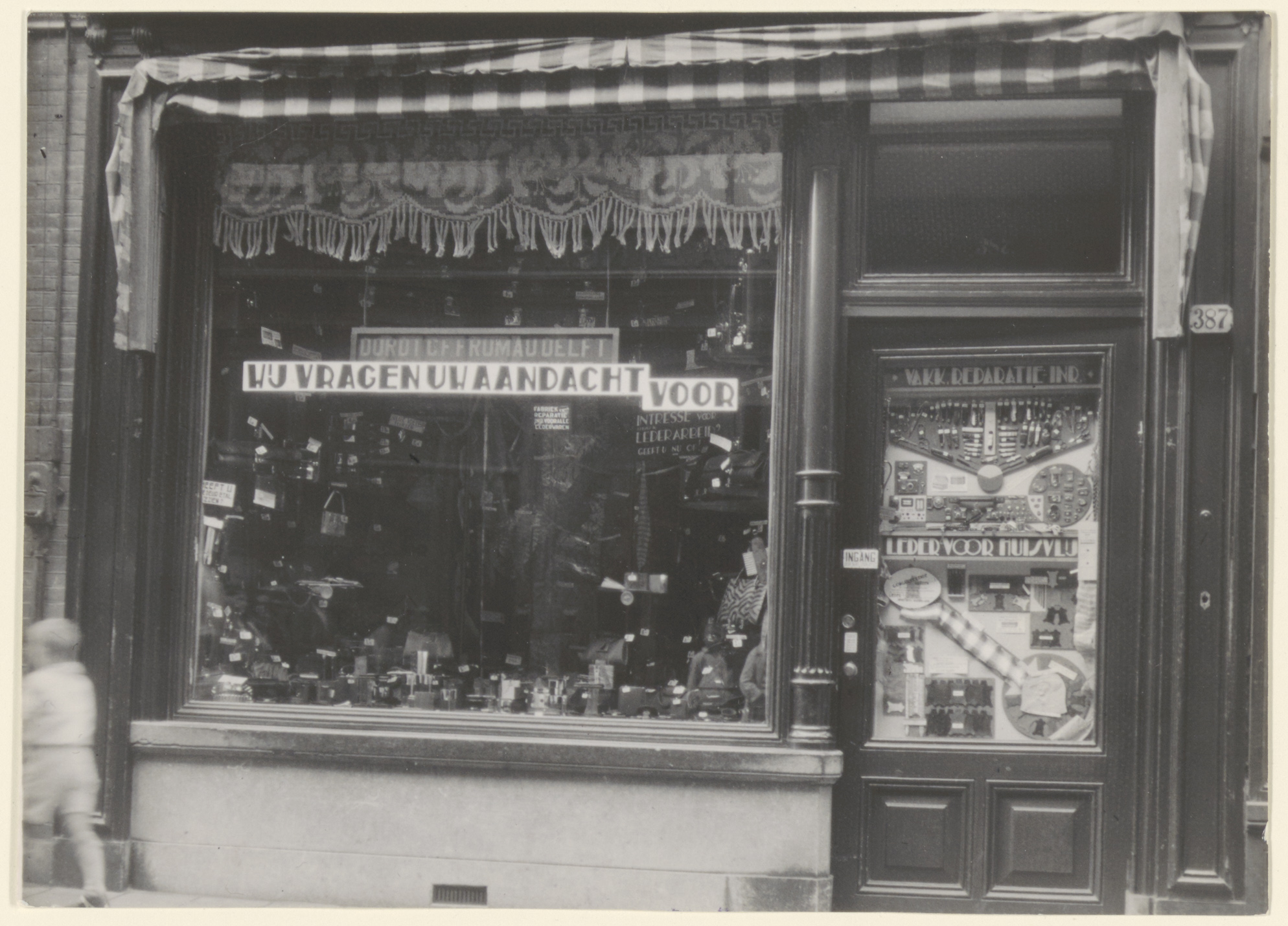 Etalage van het magazijn en de fabriek van C.F. Frumau, die fijne lederwaren verkocht aan de Voorstraat 387 (oud nr.).