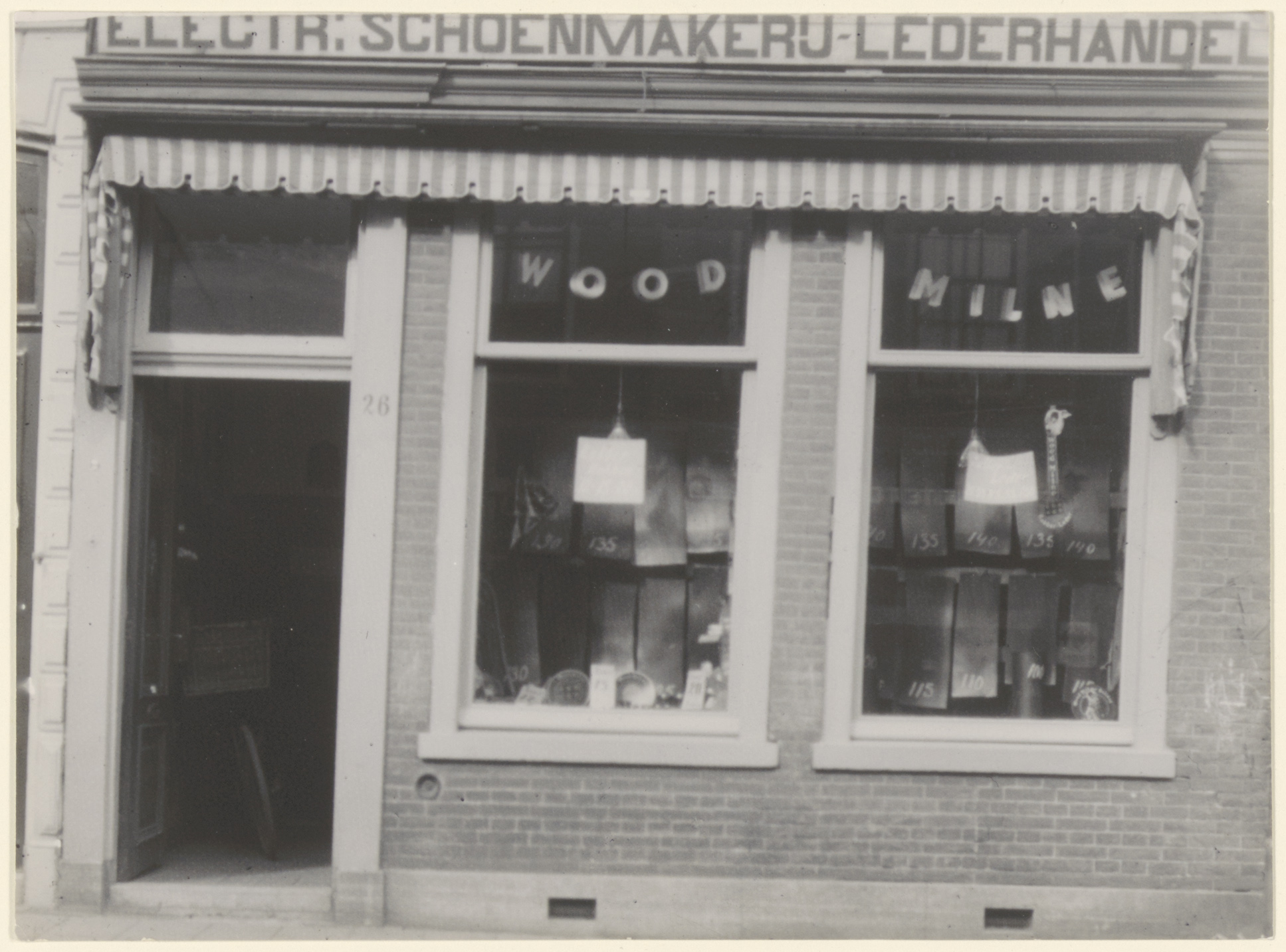 - Etalages van de Brabantsche winkel, een schoenmakerij, lederhandel en winkel in schoenmakersgereedschappen van F.A.A. Boer aan het Steegoversloot 26 (oud nr.)