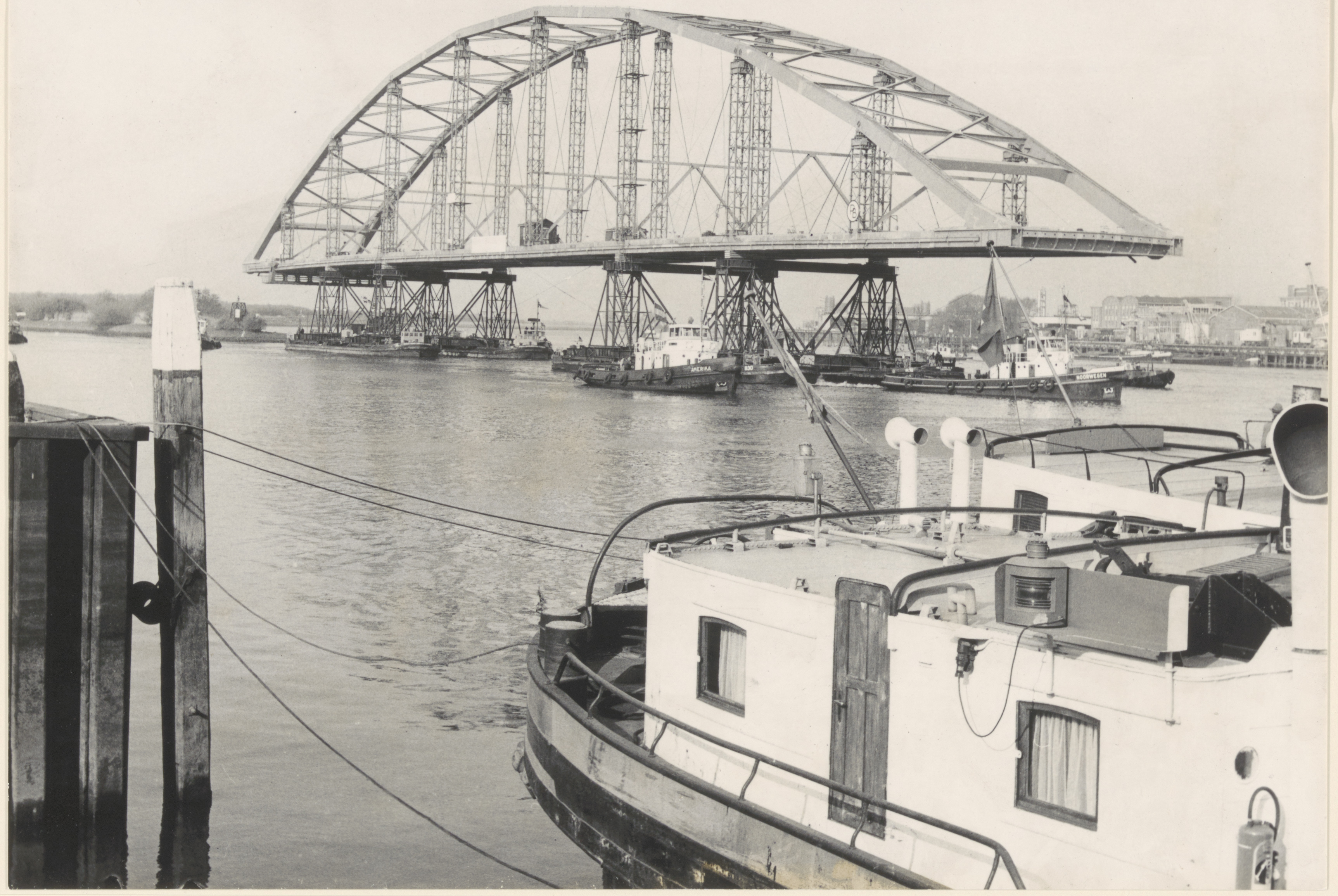 Vervoer van de bij Penn & Bauduin gebouwde overspanning van de Merwedebrug; de brug …