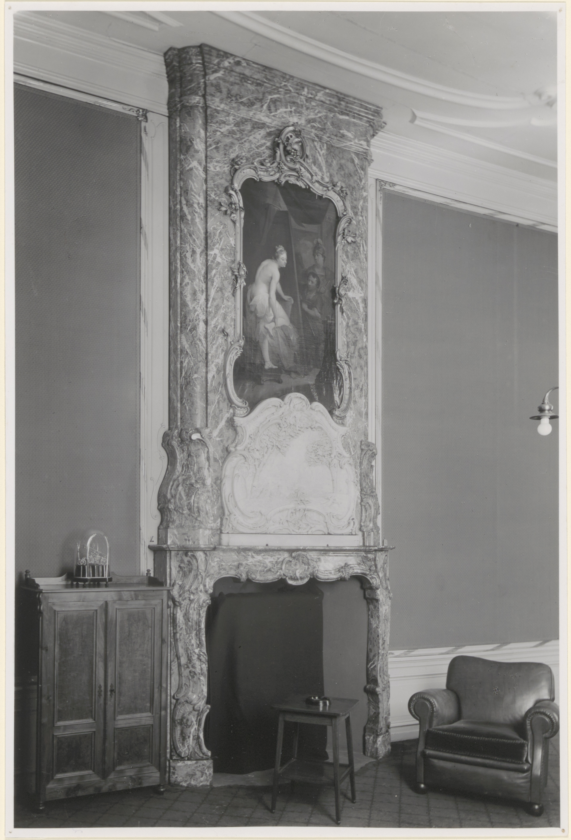 - Marmeren schoorsteen in de voorkamer rechts van de ingang van het huis De Onbeschaamde in de Wijnstraat; met stucwerk en schildering van een zich ontkledende vrouw door twee heren bespied.