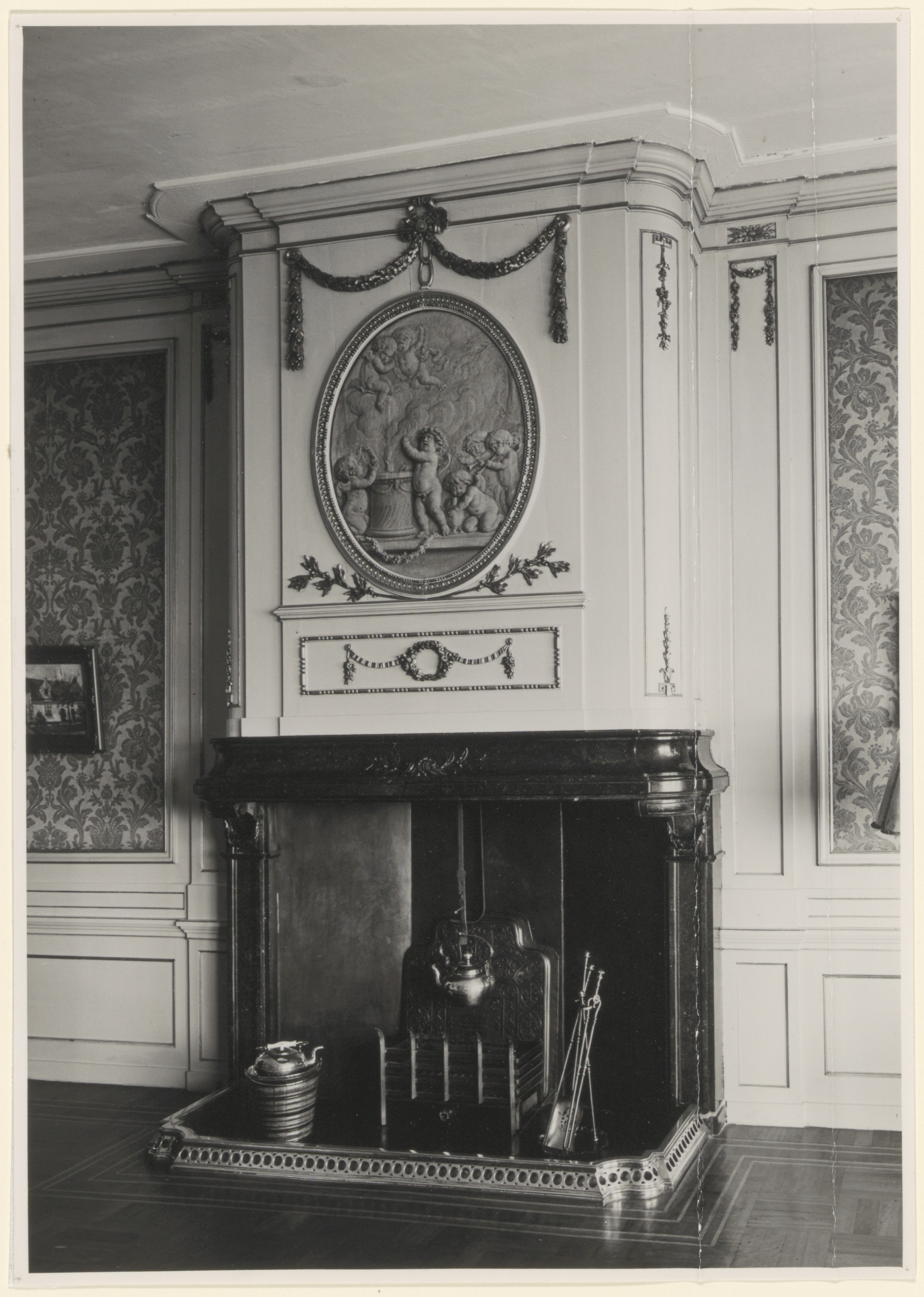 Schoorsteen met reliëfwerk (puttoos) in een ovaal in een huis aan de Wolwevershaven.