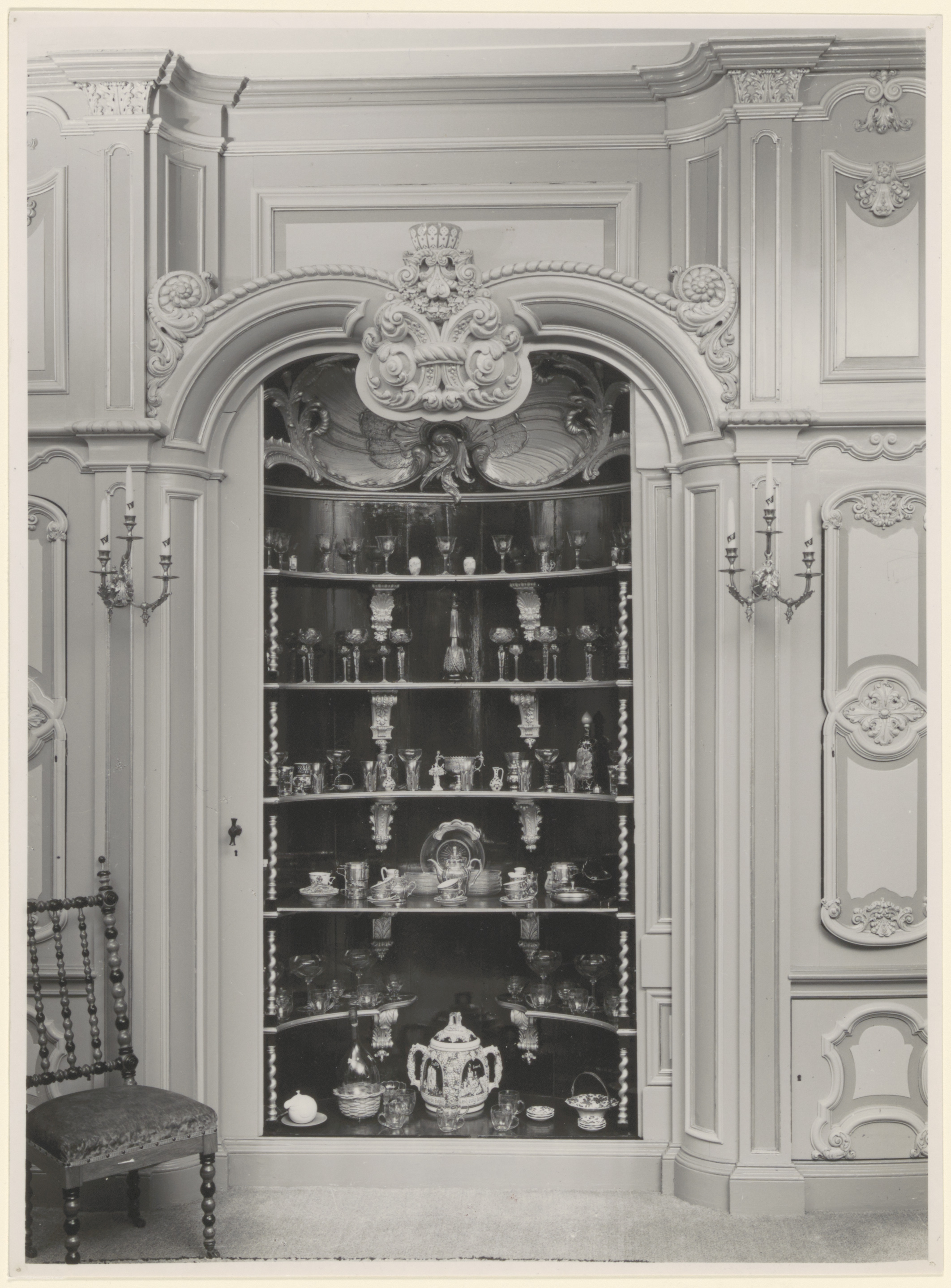 - Een ingebouwde kast met glaswerk en porselein in een kamer in een onbekend huis.