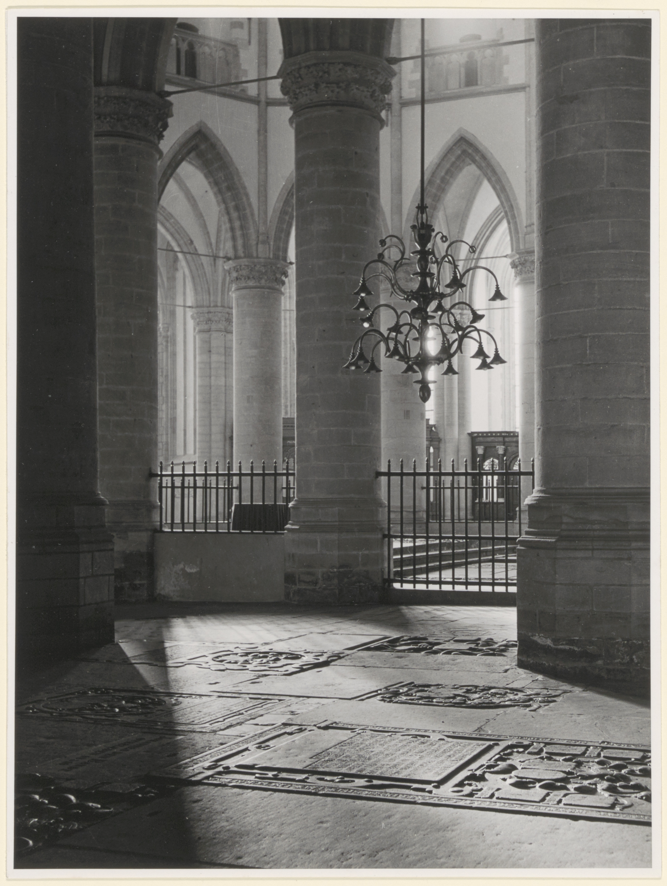 Gezicht in het koor van de Grote Kerk met op de voorgrond grafstenen in de vloer.