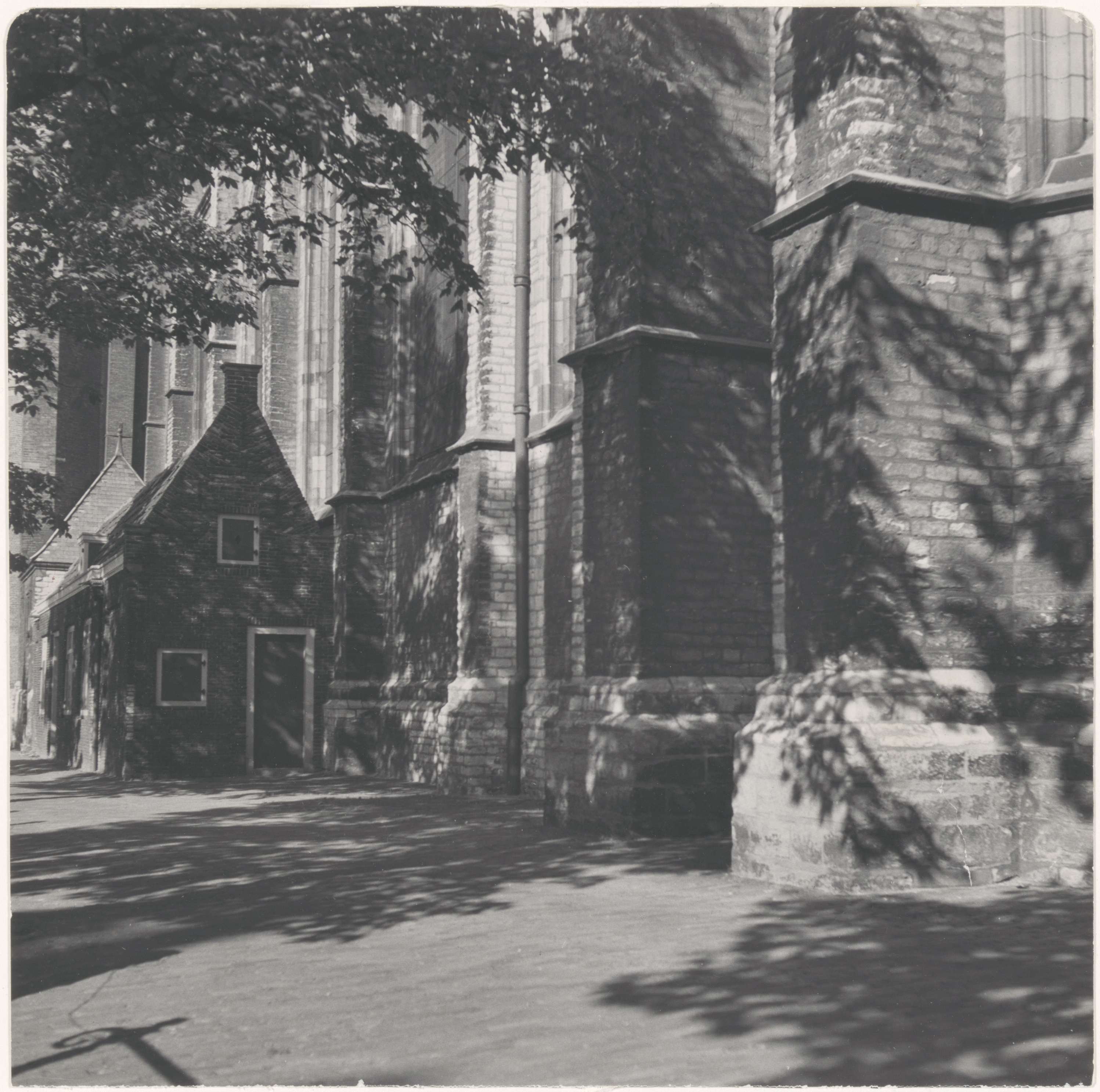 Huisjes aan de voet van de Grote Kerk aan de Pottenkade, gezien naar het westen.