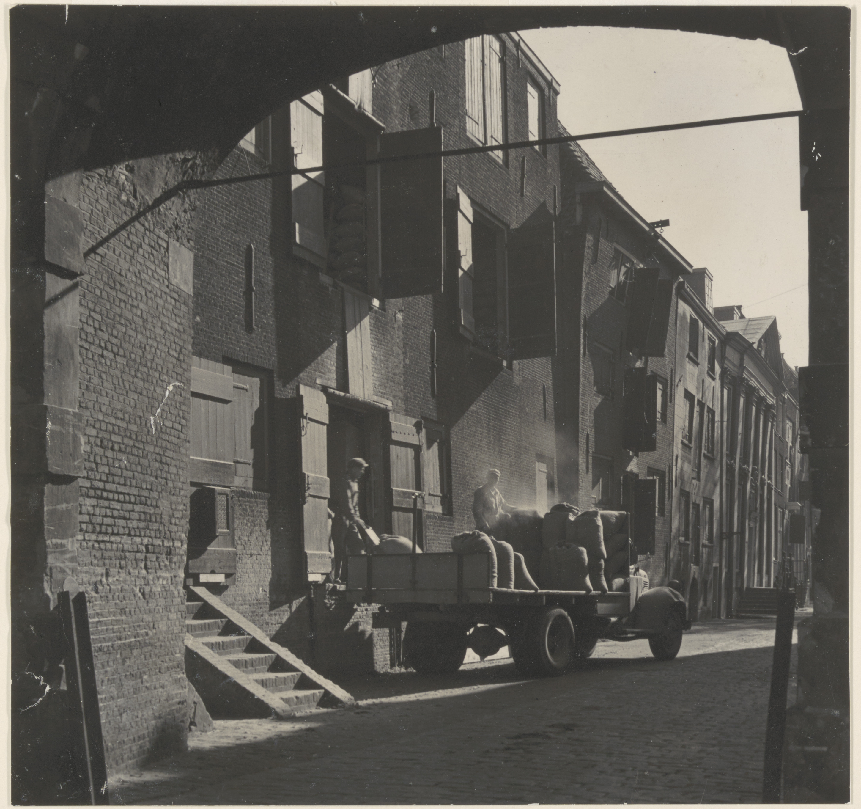 - Een vrachtwagen met zakken meel bij pakhuis Rusland aan de Korte Engelenburgerkade, gezien vanuit de Catrijnepoort. Naastliggende pakhuizen heten Engeland en Neurenberg. Rechts huis Beverschaap.