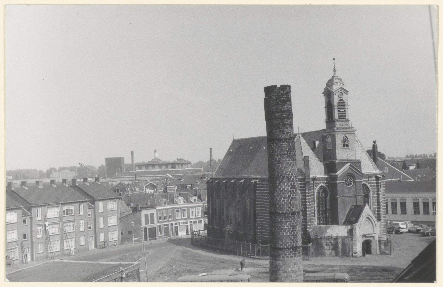 - Het Nieuwkerksplein met de Nieuwkerk, gezien van het dak van het huis op de noordelijke hoek Voorstraat/Nieuwkerkstraat; op de voorgrond de schoorsteen van bakkerij De Berenkamp in de Wijngaardstraat, links de Torenstraat. Rechts het schoolgebouw op de hoek van de Vest.