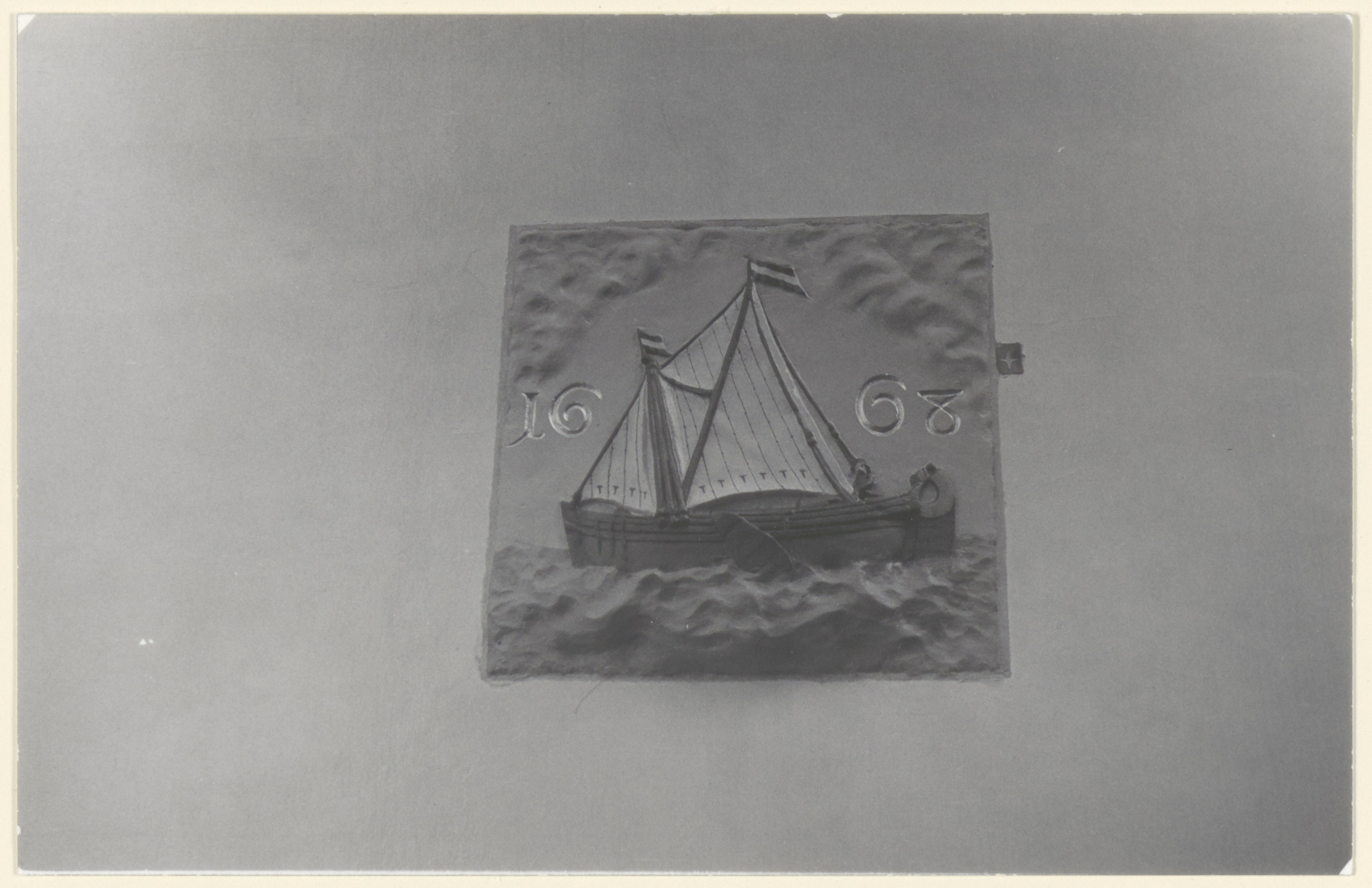 Gevelsteen met zeilende, vlaggende kaag met spriettuig en jaartal 1668, omstreeks 1973 …