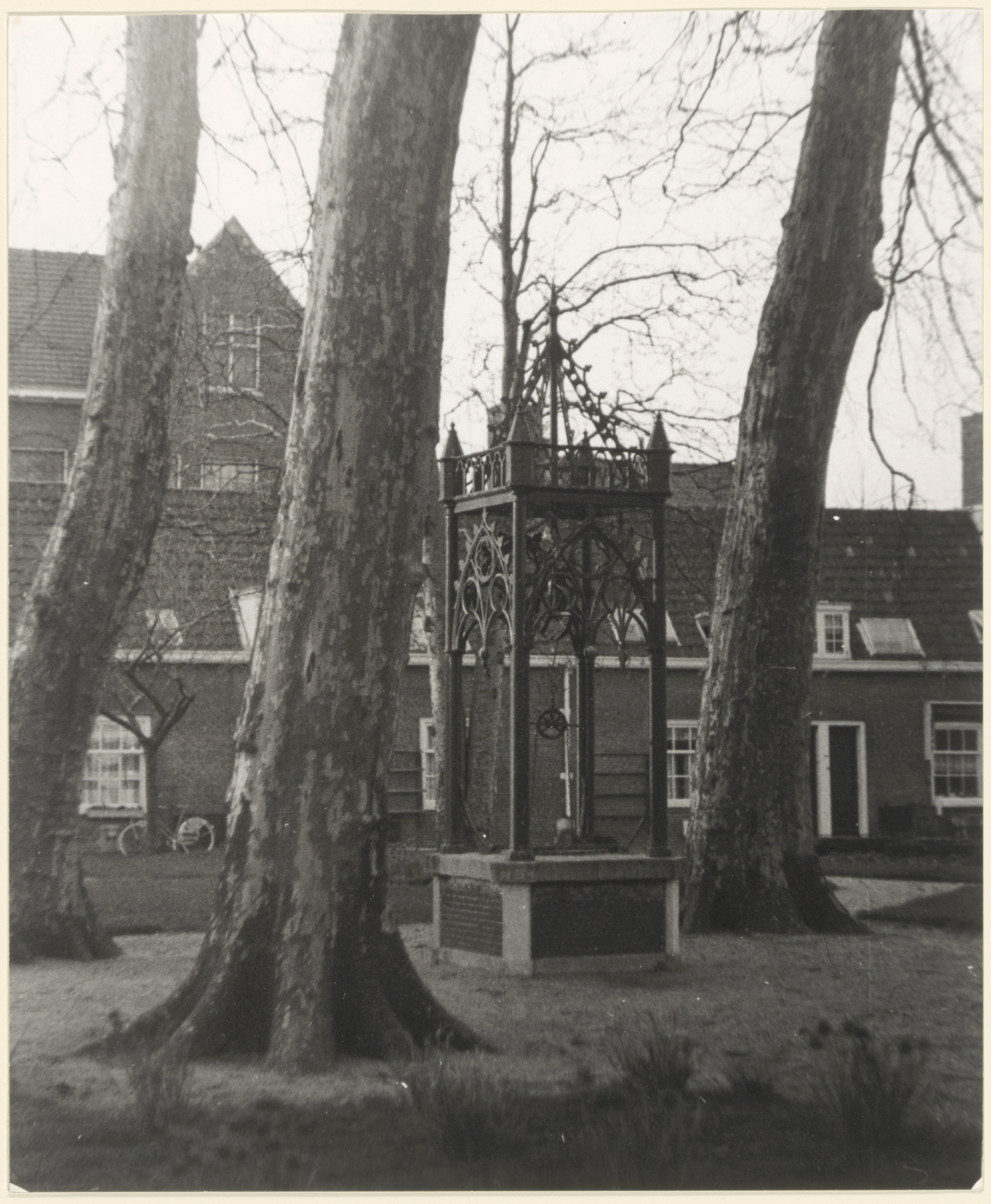 - Waterput in de Arend Maartenshof omgeven door drie platanen. Op de achtergrond de school in de Museumstraat.