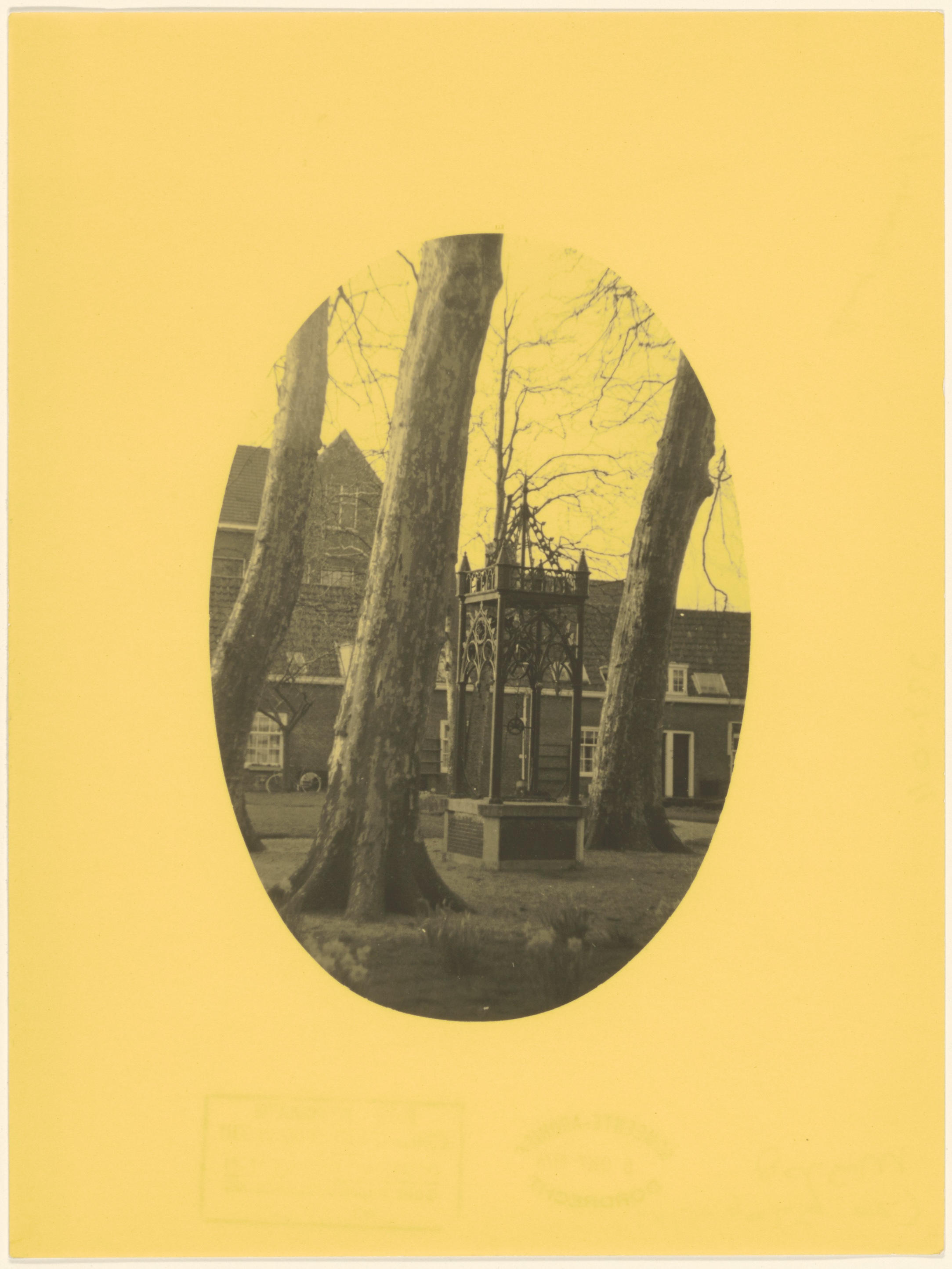 - Waterput in de Arend Maartenshof omgeven door drie platanen. Op de achtergrond de school in de Museumstraat.