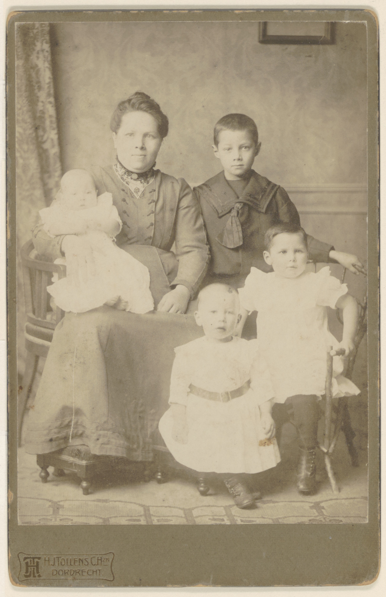 Portret van een moeder met baby, peuter, kleuter en een jongetje.