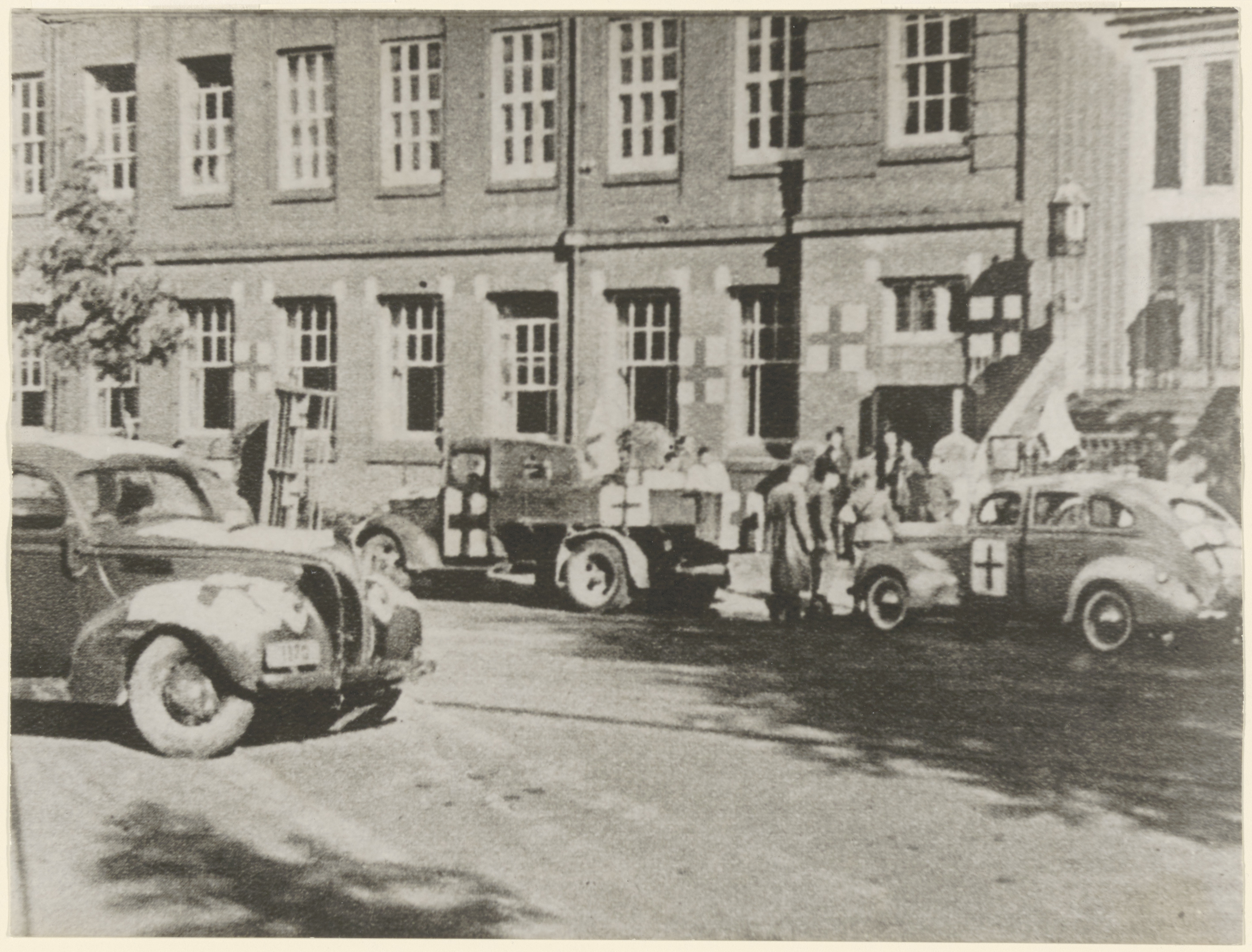 - De MTS aan de Oranjelaan in de meidagen van 1940 ingericht als noodhospitaal met ervoor particuliere auto's met rode kruizen dienstdoend als ambulance.