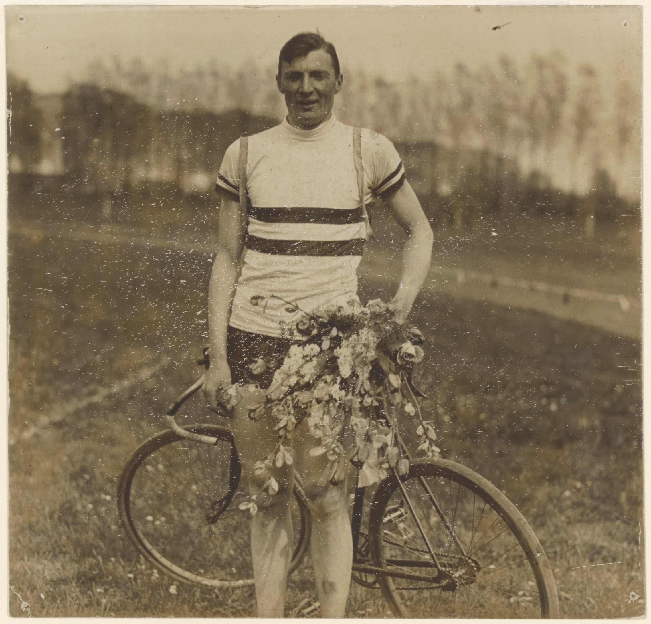 Wielerkampioen 1937 Jan van Egmond met fiets en bos bloemen in het Sportpark Reeweg.