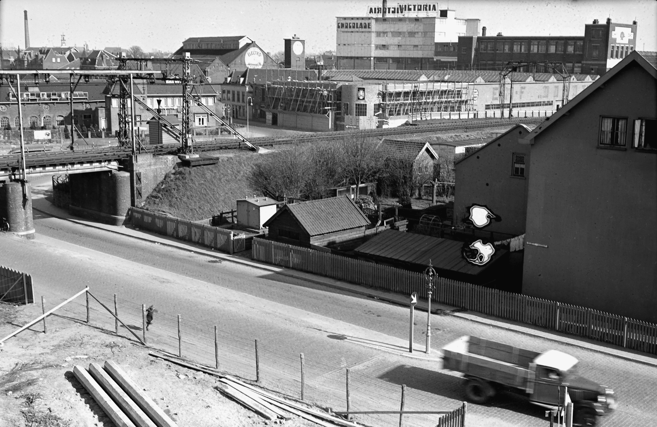 De Dokweg vanaf de trappen van de verkeersbrug. Op de achtergrond de hoek Wilgenbos/Korte Parallelweg met de fabrieken EMF en Victoria.