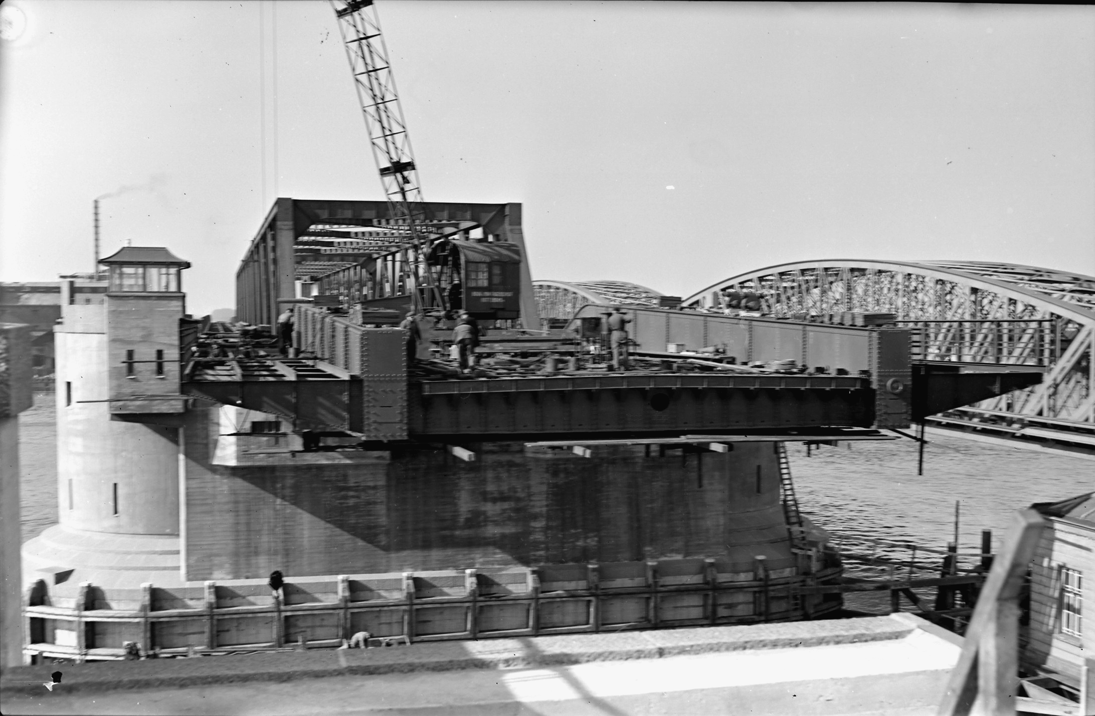 Bouw van de klep aan de noordzijde van de verkeersbrug over de Oude Maas. De bogen zijn van de spoorbrug naar Zwijndrecht.