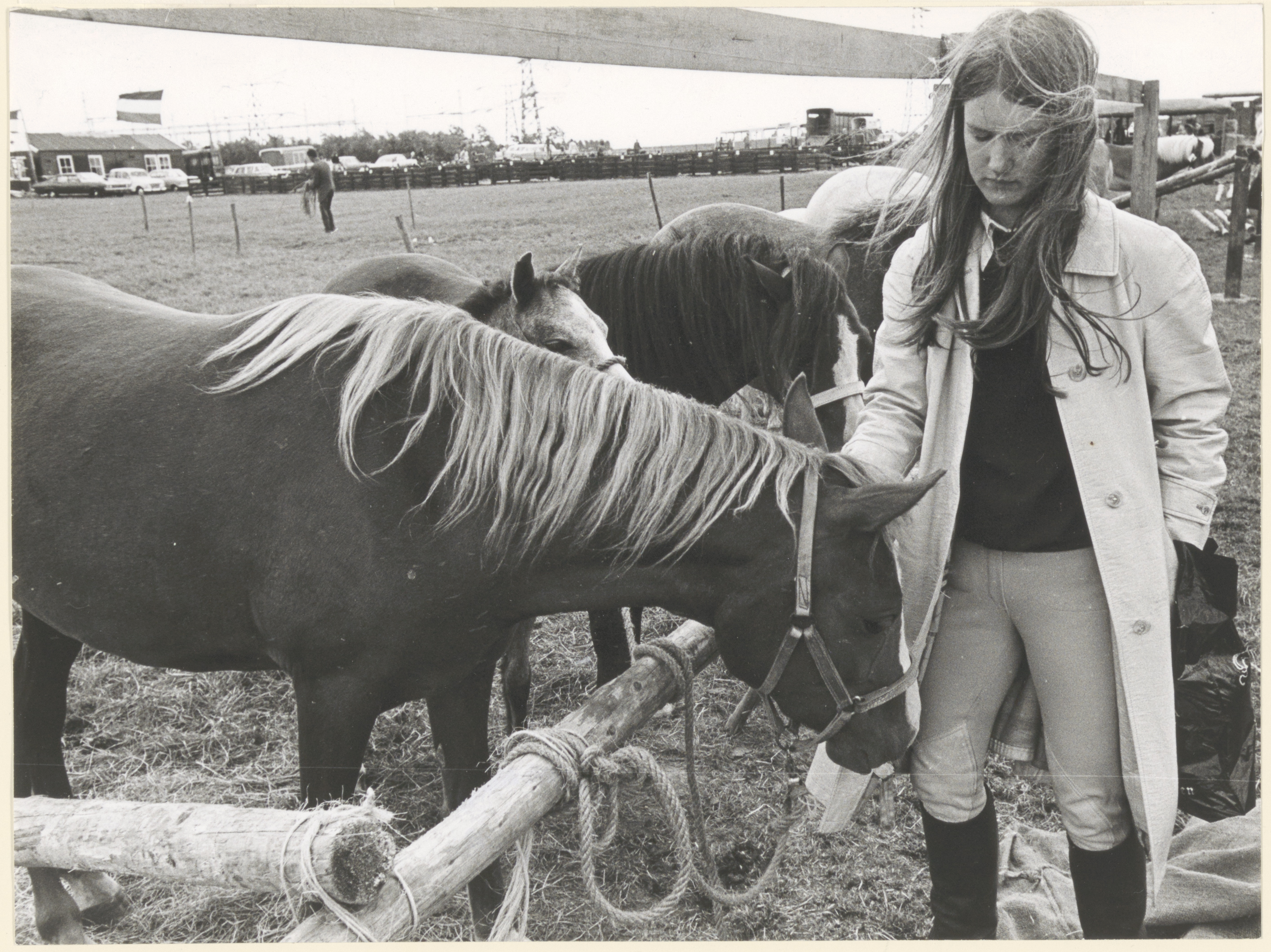 - Een meisje aait een pony op een ponykeuring op de 29e landbouwtentoonstelling, de Dag van Mens en Dier, in de Merwelanden.