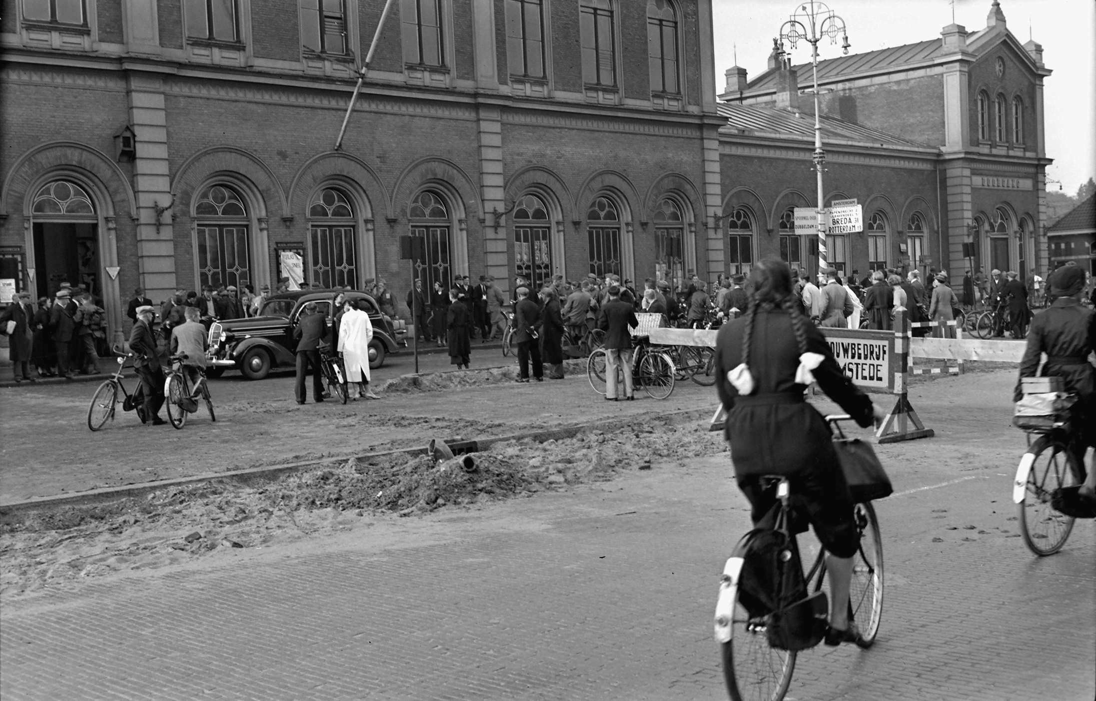 - fietsers lantaarns / straatverlichting reizigers richtingborden / wegwijzers stations(gebouwen) wegenbouw