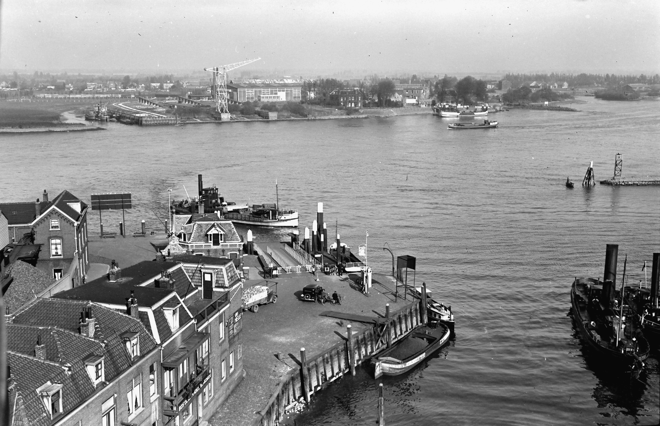 - Gezicht op Papendrecht vanaf een gashouder aan de Bleijenhoek over de Riedijkshaven en de Merwede. Op de Dordtse en de Papendrechtse oever ligt een veerboot. De hijskraan staat op het terrein van Aviolanda.
