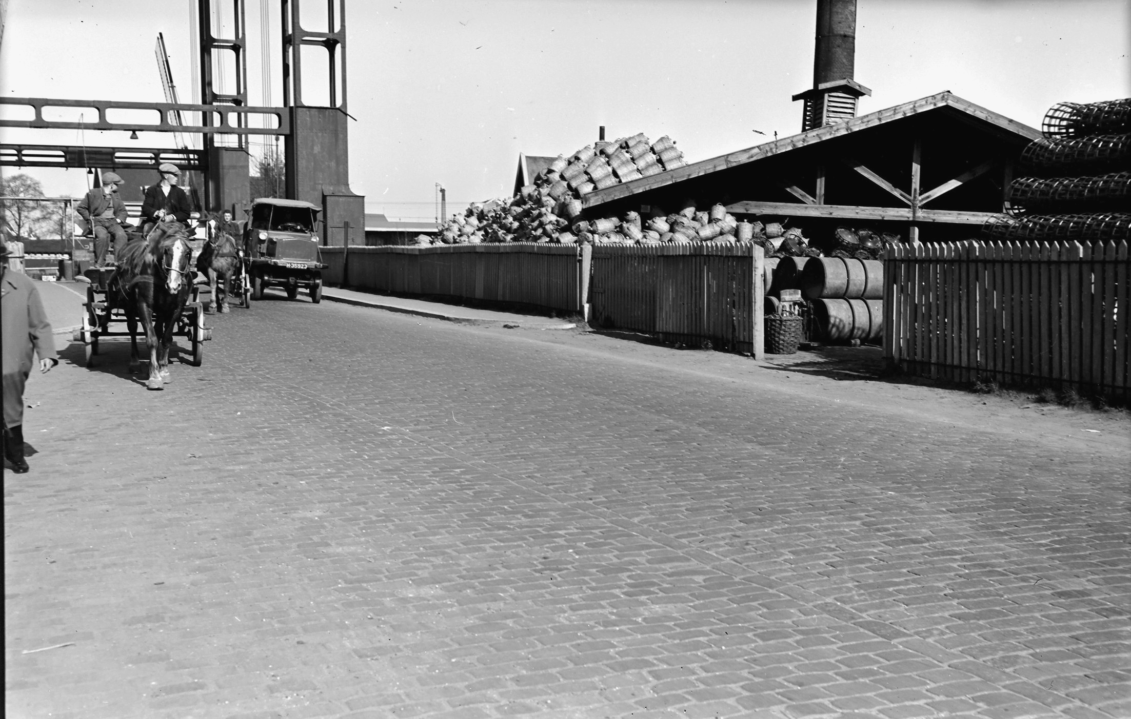 De Dokweg en de Dokbrug gezien in de richting van de stad. Rechts is een opslag van vaten en mandflessen voor chemicaliën.