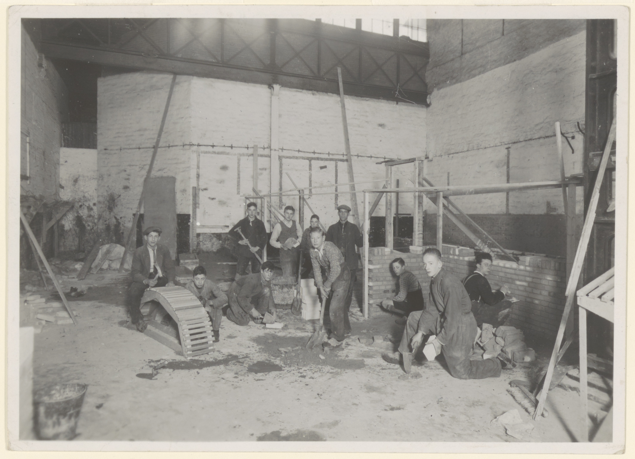 Leerlingen (werkelozenonderwijs) van de afdeling metselen van de Centrale Werkplaats in …