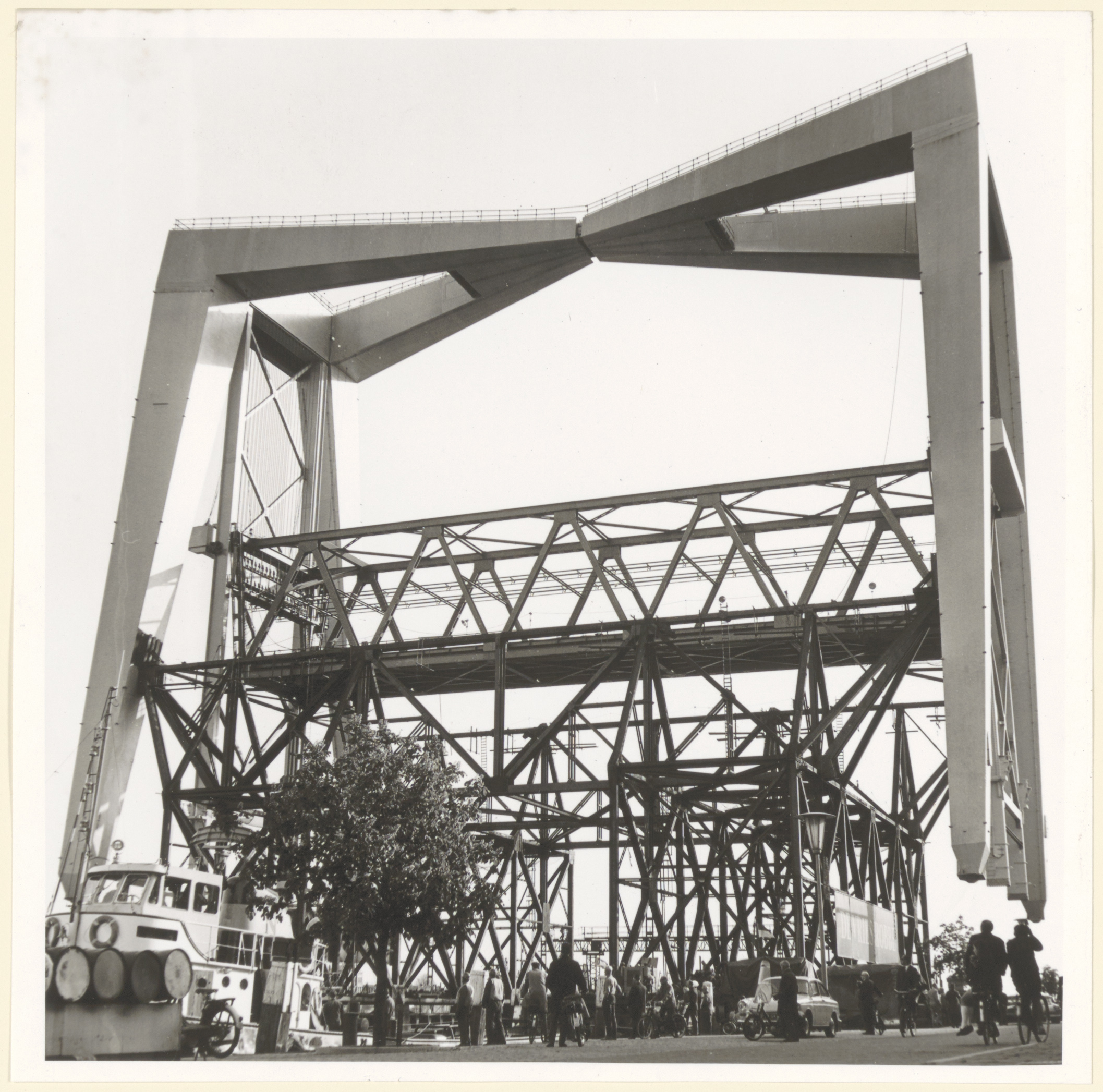 De nieuwe spoorhefbrug voor de Oude Maasbrug ligt aan de Buiten Kalkhaven te wachten op …