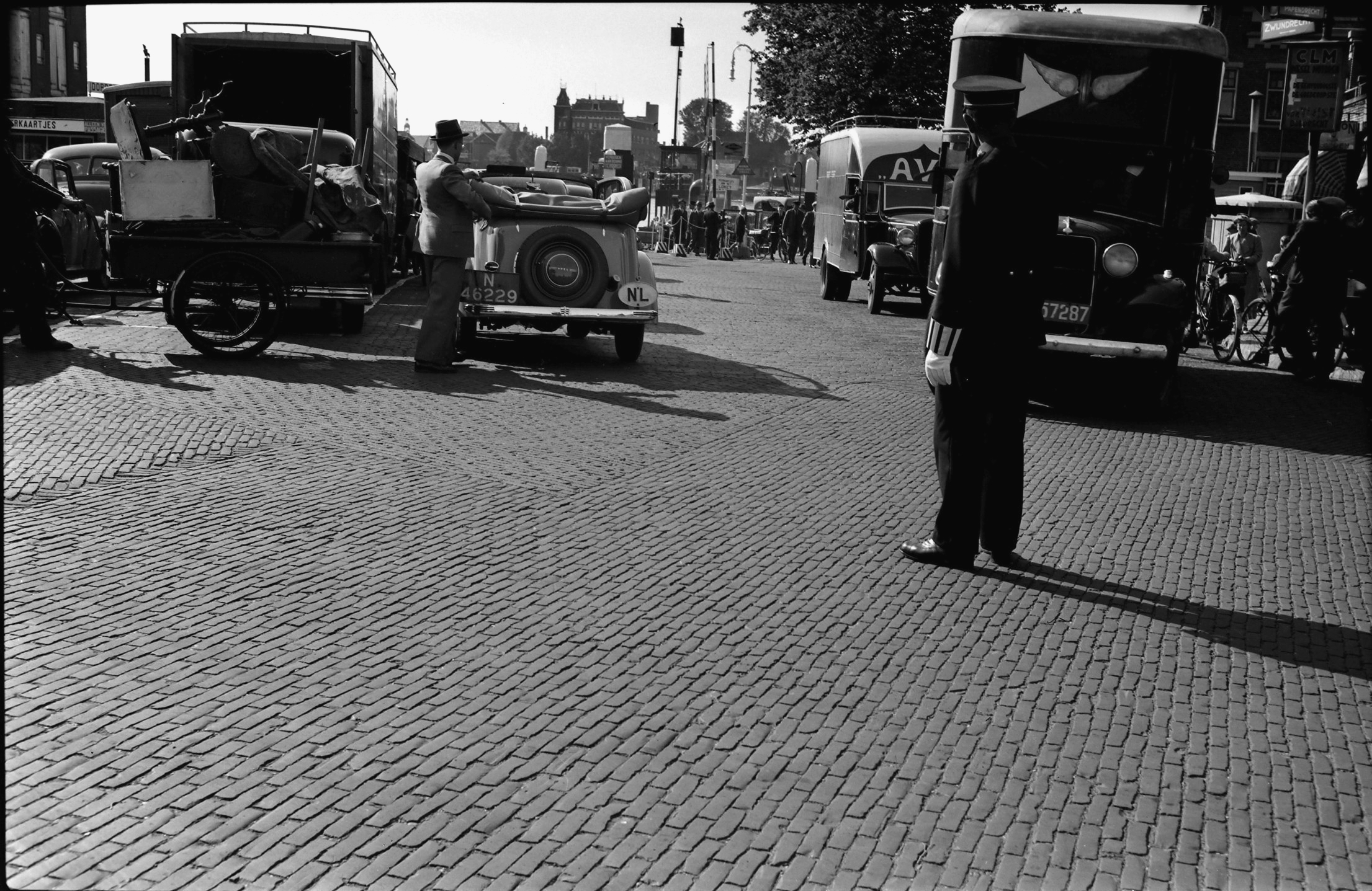 Druk verkeer op het Blauwpoortsplein bij het Zwijndrechts veer. Op de achtergrond hotel Het Witte Paard in Zwijndrecht.