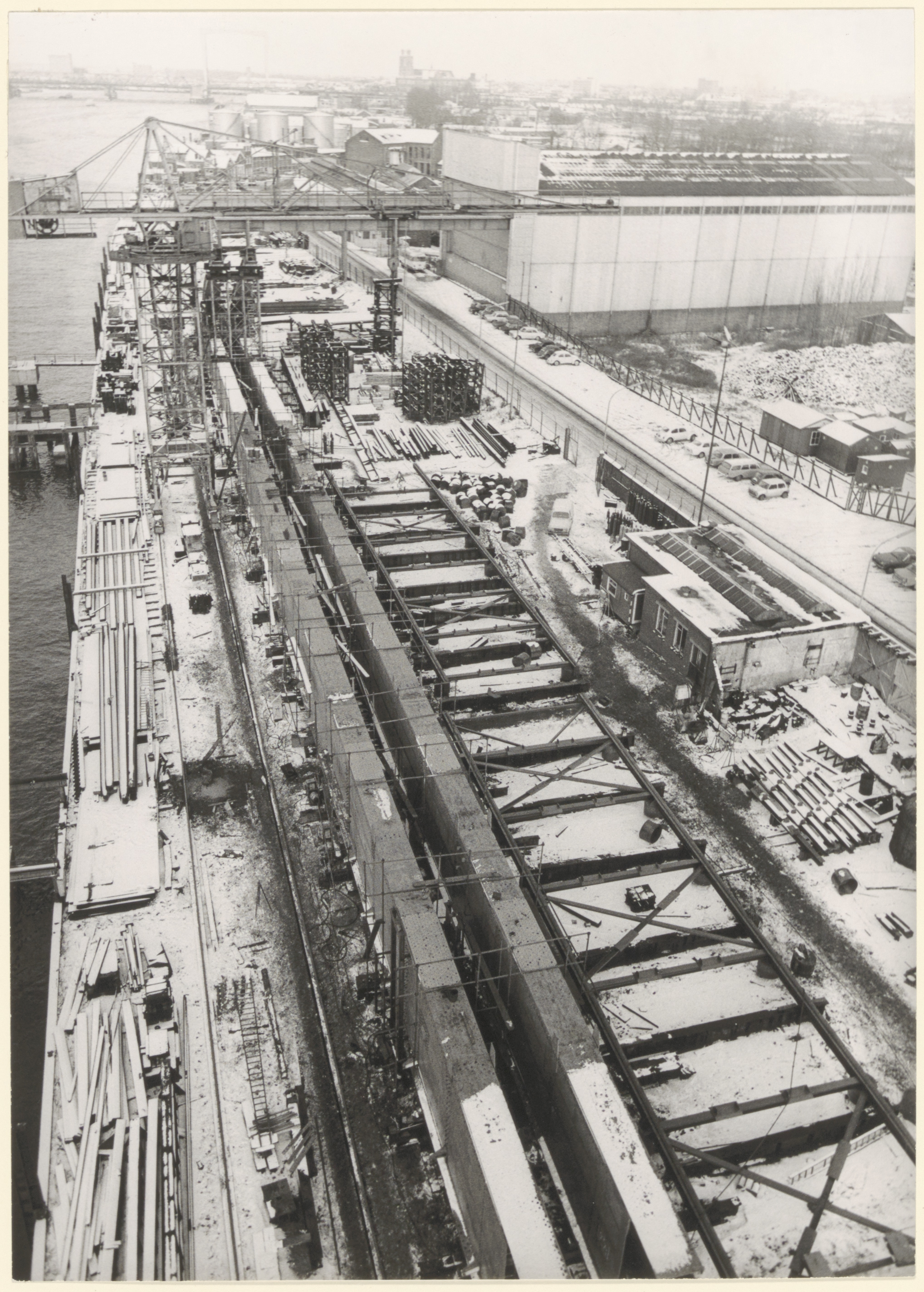 De werf van metaalconstructiebedrijf Penn & Bauduin aan de 's-Gravendeelsedijk. Centraal het terrein voor bruggenbouw, links het Mallegat.