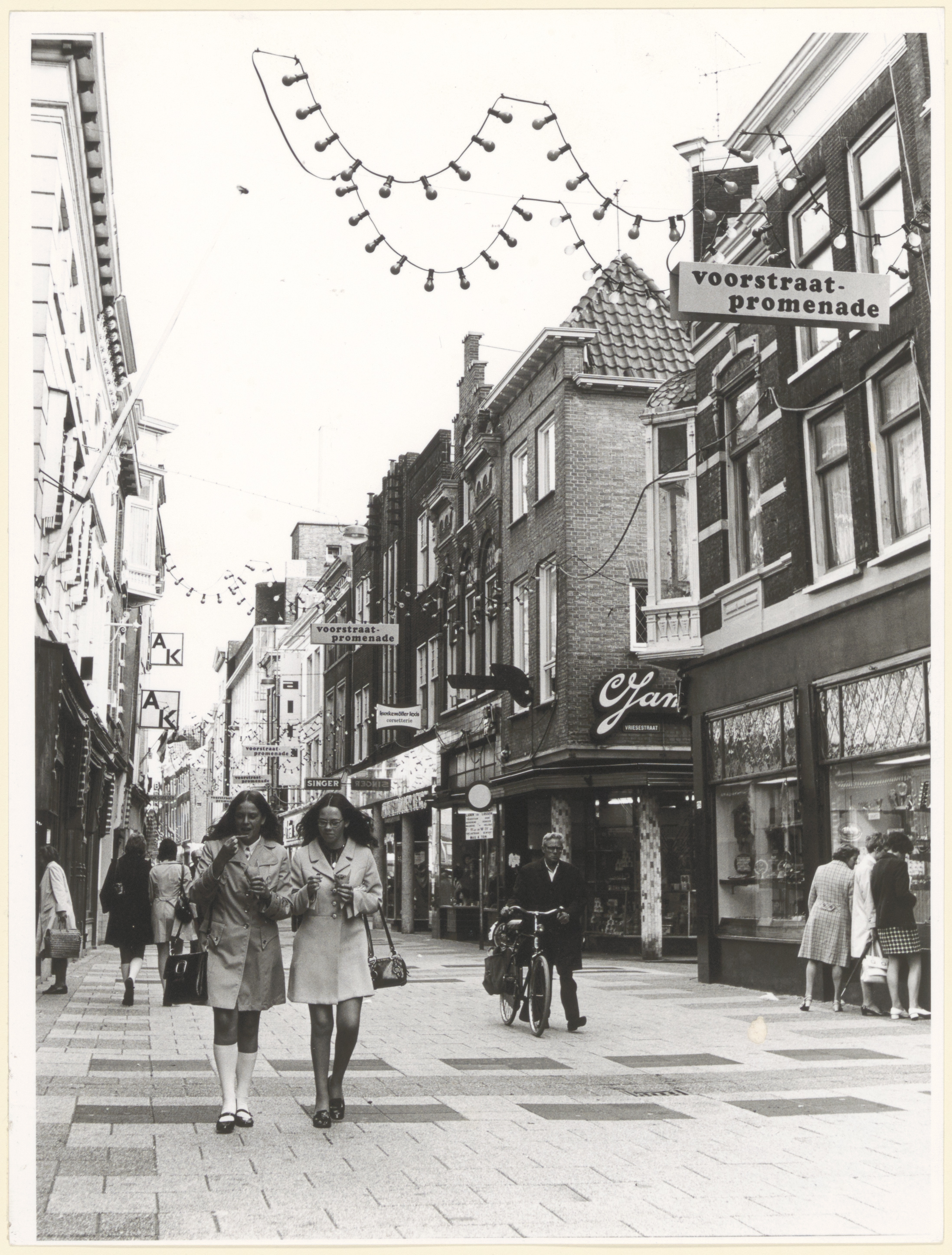 - De niet-brandende feestverlichting op de Voorstraatpromenade; rechts de ingang van de Vriesestraat.