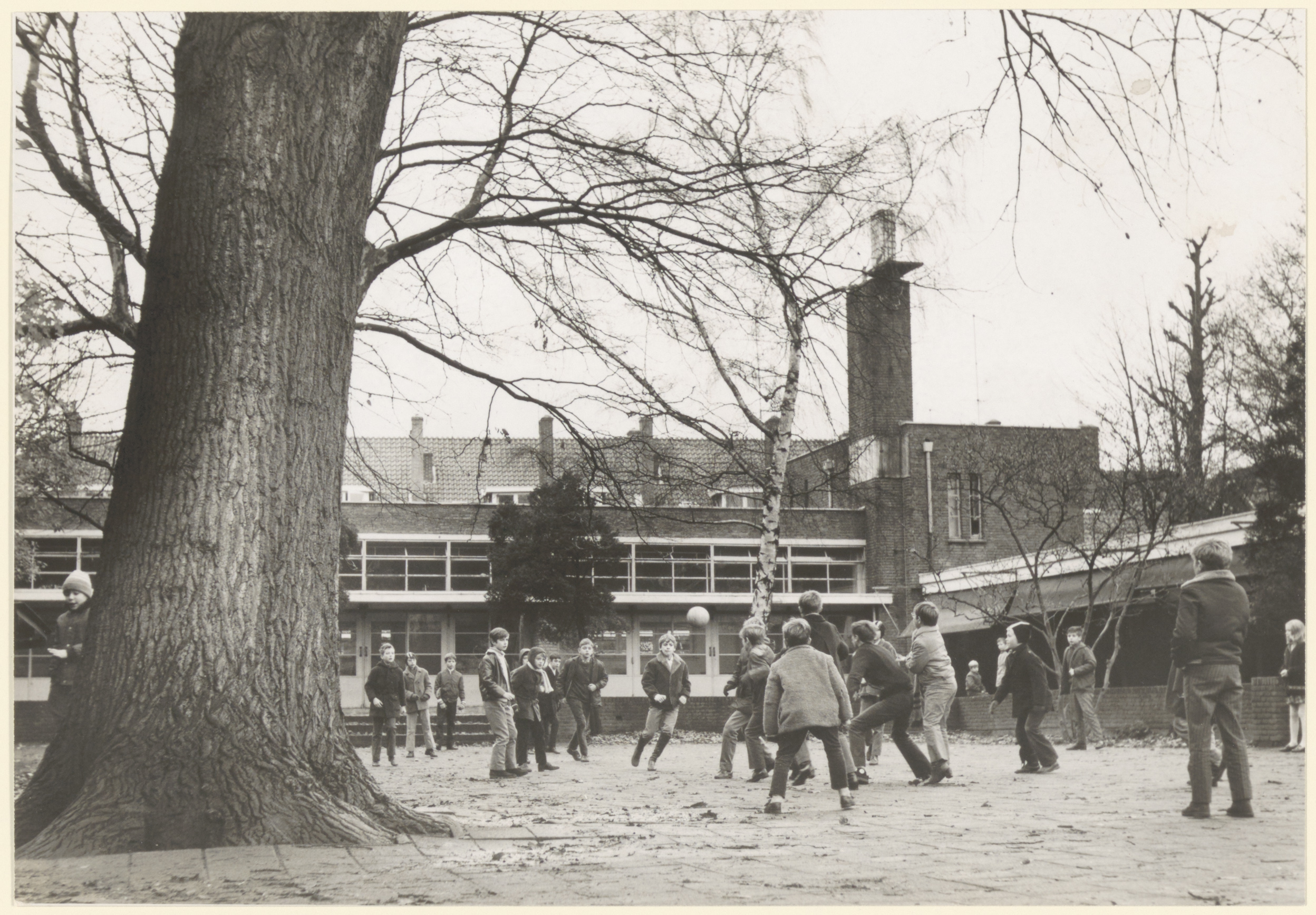 - Voetballende schooljeugd op het schoolplein van de Dordtse Buitenschool aan de Vrieseweg.