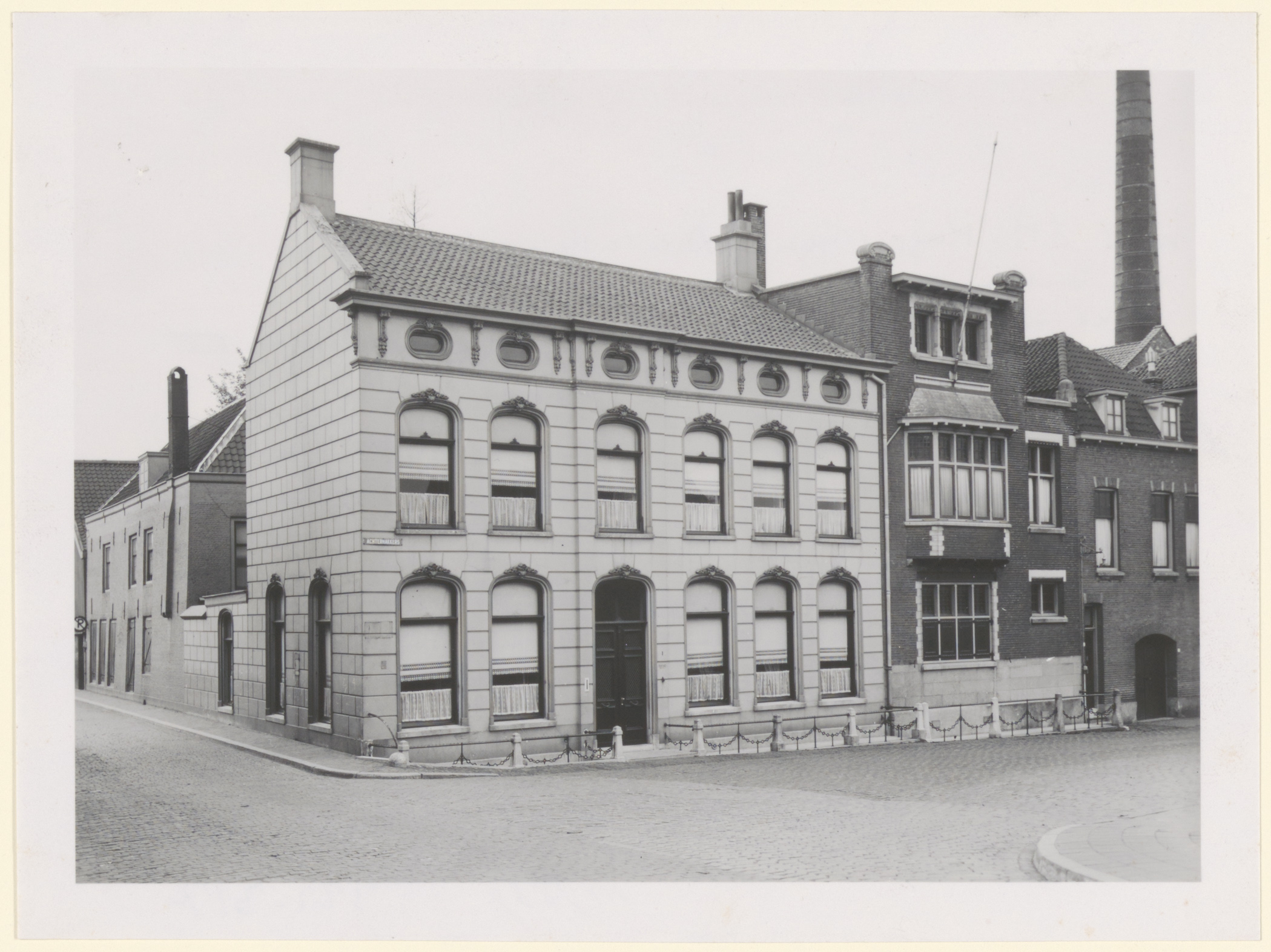 Pand aan het Achterhakkers, hoek Sluisweg (links). Het werd tot 1937 bewoond door S.M.H. van Gijn. Later was het huis in gebruik als belastingkantoor en als kantoor van de naastgelegen Dogcakefabriek, waarvan de schoorsteen zichtbaar is.
