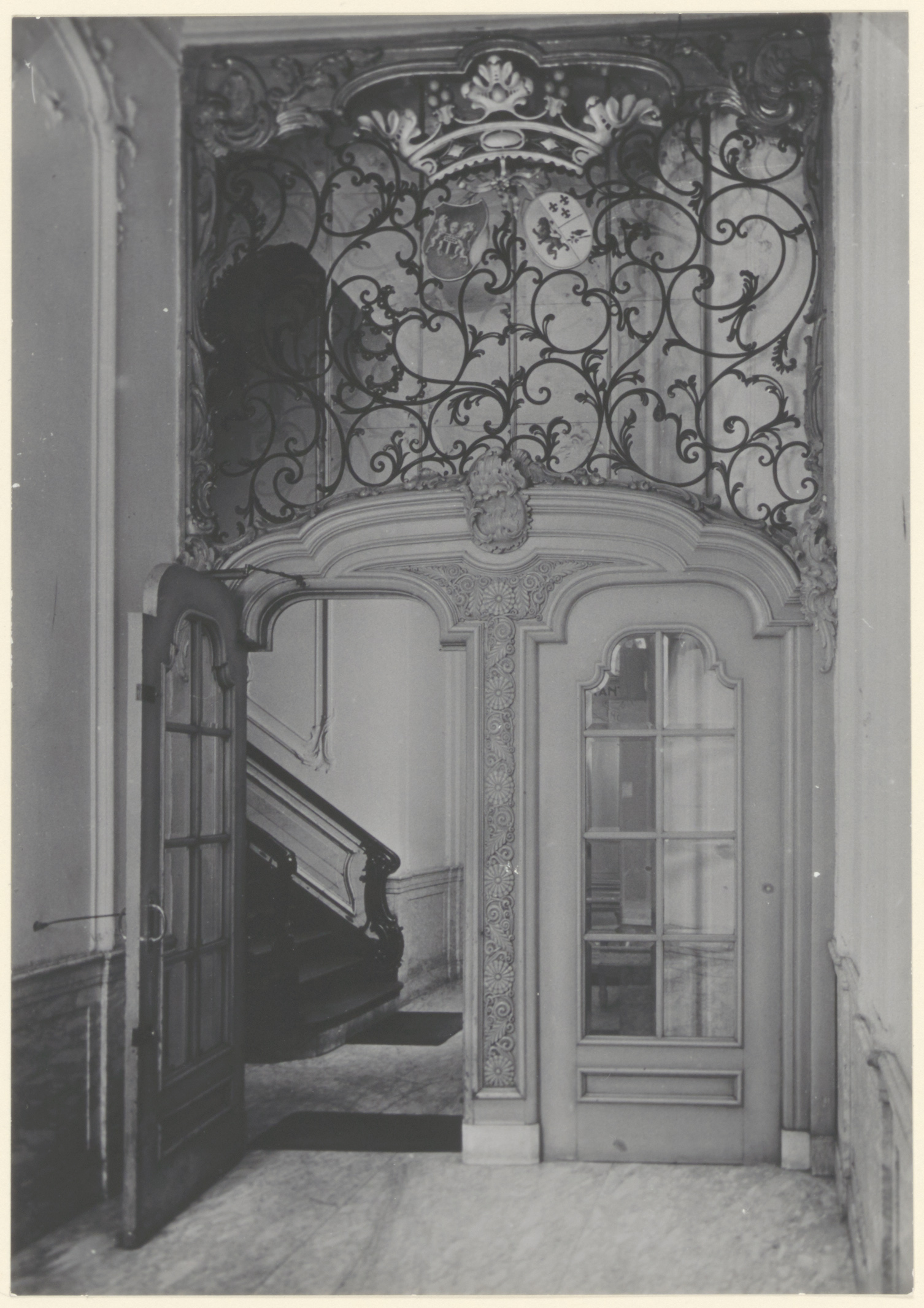 Hal met dubbele deuren met bovenlicht met wapens in het huis De Onbeschaamde aan de Wijnstraat.