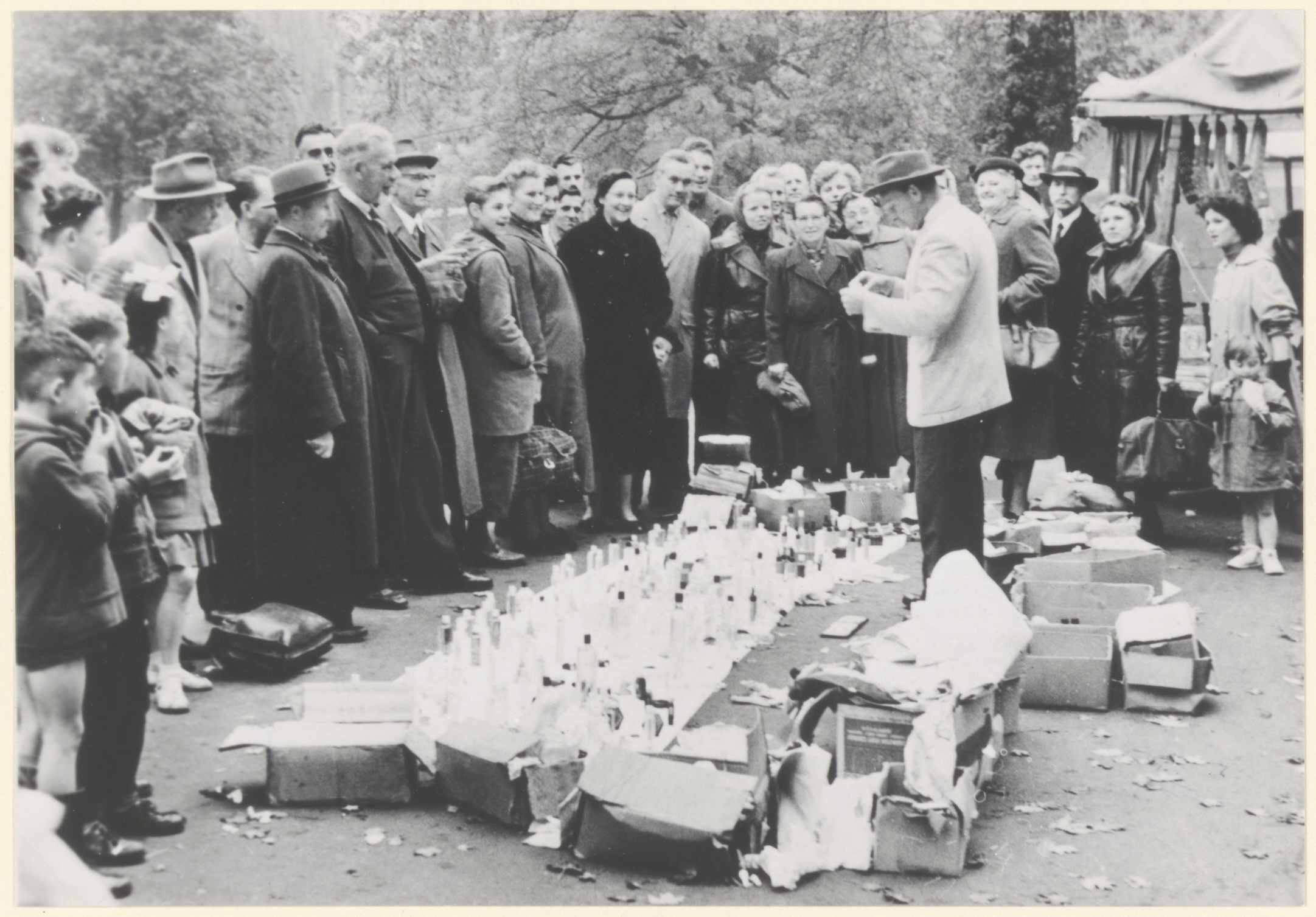 Een marktkoopman slijt zijn waar, flesjes met onbekende inhoud, omringd door publiek op een niet nader te lokaliseren plaats.
