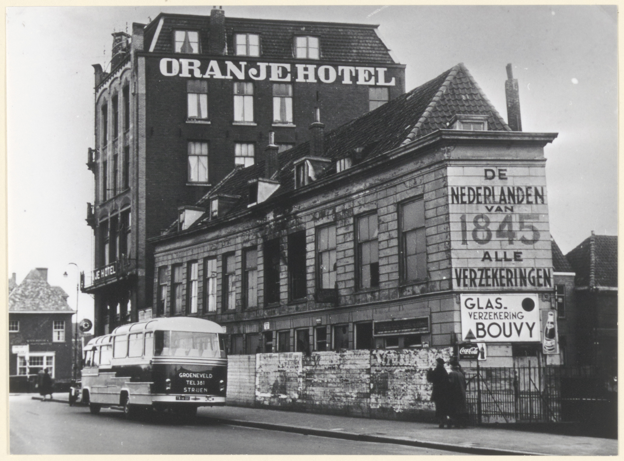 - De Johan de Wittstraat, gezien uit het noorden naar de Johan de Wittbrug. Het Oranje Hotel staat op de hoek van de Vest.