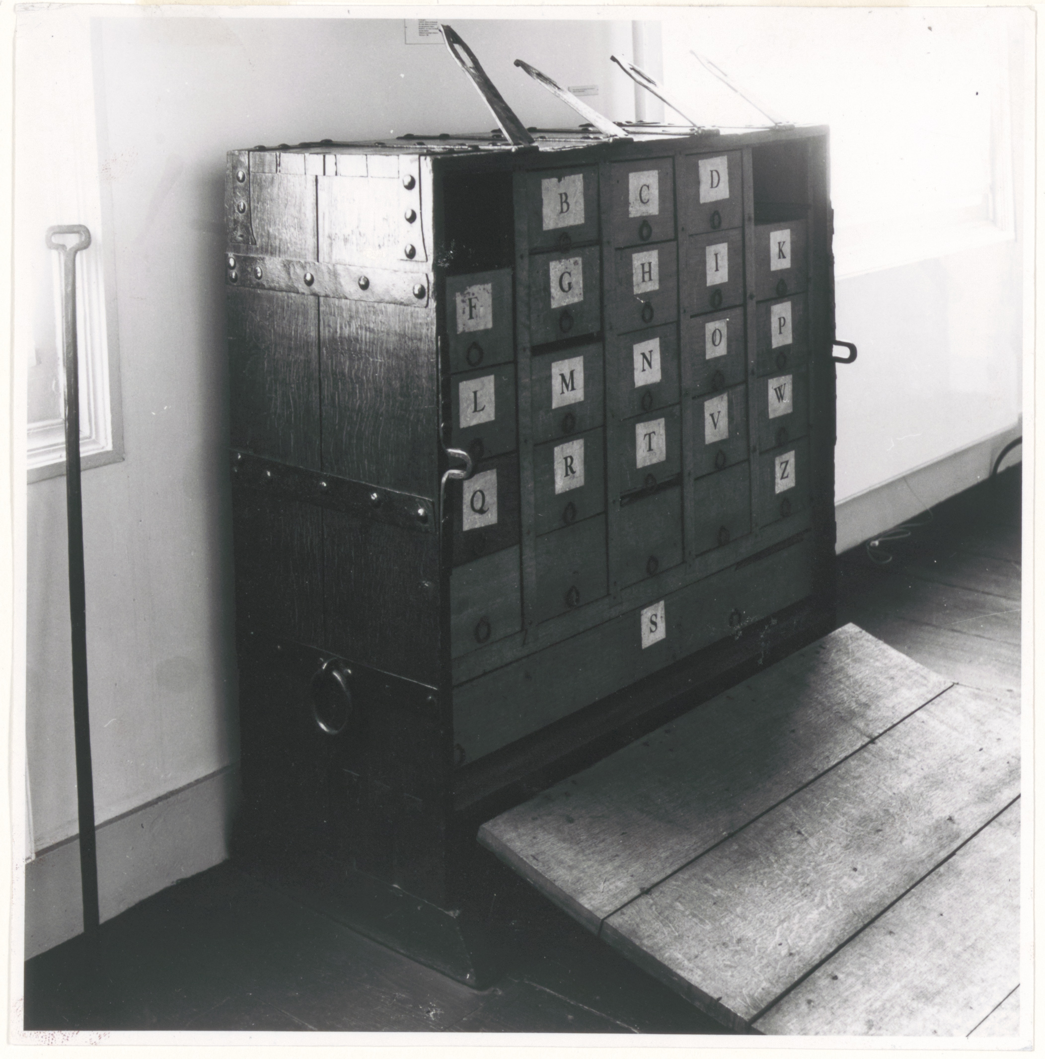 De uit de 2e helft van de 15e eeuw stammende eikenhouten charterkist, de oudste bergplaats van de gemeentelijke archieven, in Museum mr. Simon van Gijn aan de Nieuwe Haven.