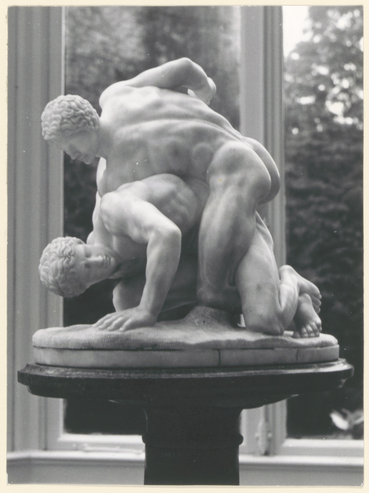 Marmeren beeld van twee worstelende jonge naakte mannen met kort krullend haar op een zuil, in de eetkamer-serre van Museum mr. Simon van Gijn aan de Nieuwe Haven. Het is een verkleinde 19e-eeuwse kopie van een Romeinse kopie uit de 1e eeuw v. Chr. (die in Uffizi te Florence staat) van de worstelaars van Praxiteles (4e eeuw v.Chr.).