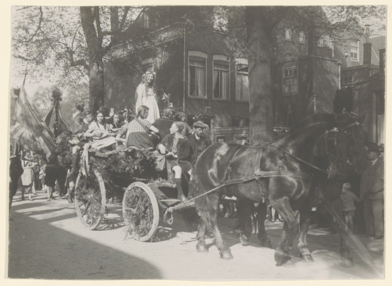 - Twee paarden trekken een versierde kar met mandoline spelende jonge socialisten in een 1 mei-optocht in de Beverwijckstraat bij de hoek van de Oudenhovenstraat.