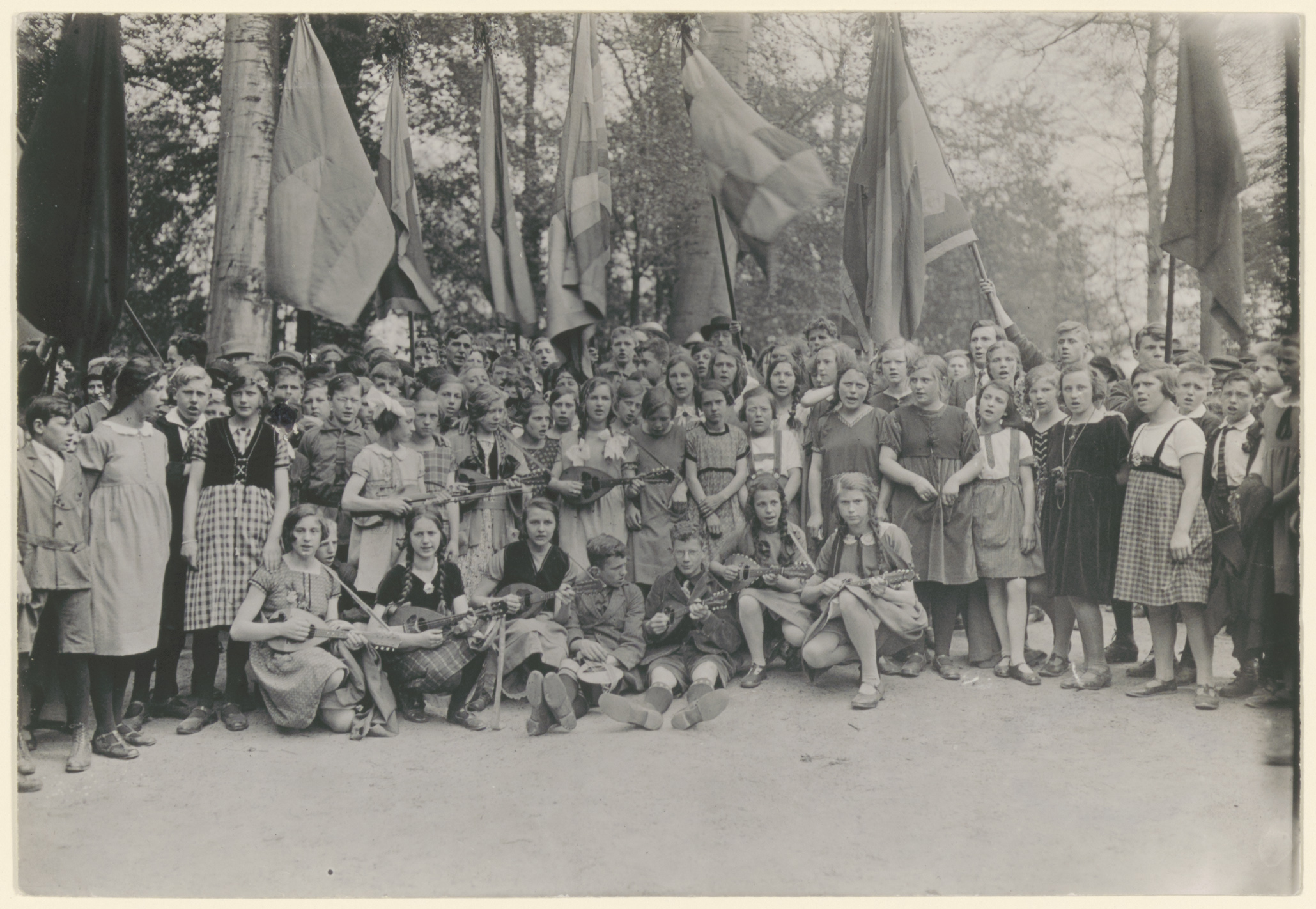 Een groep zingende door mandolines begeleide AJC'ers tijdens een 1 meiviering in Park Merwestein; vaandels op de achtergrond.