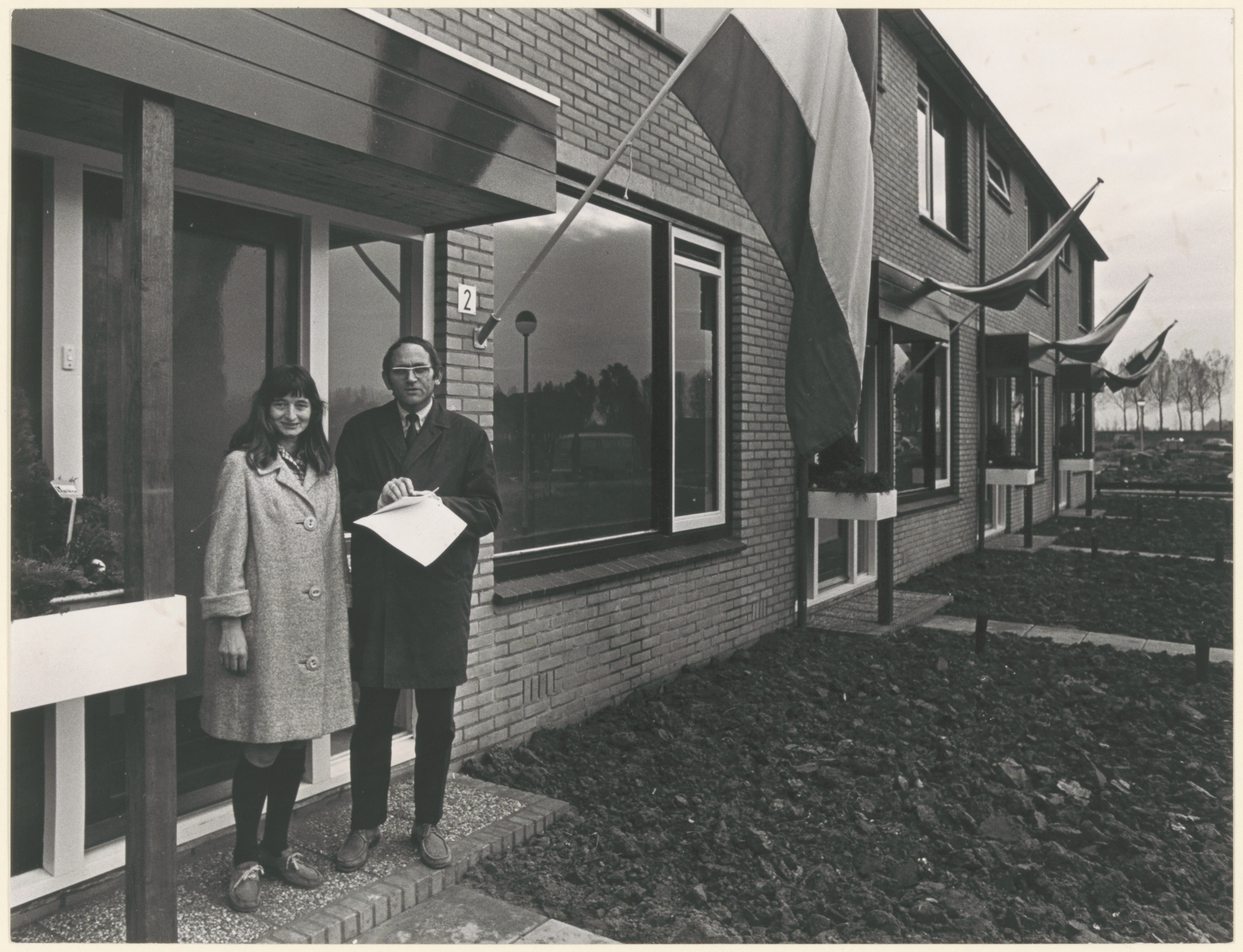 De heer en mevrouw Van Andel voor hun woning, de eerste bewoners van nieuwbouw in de …