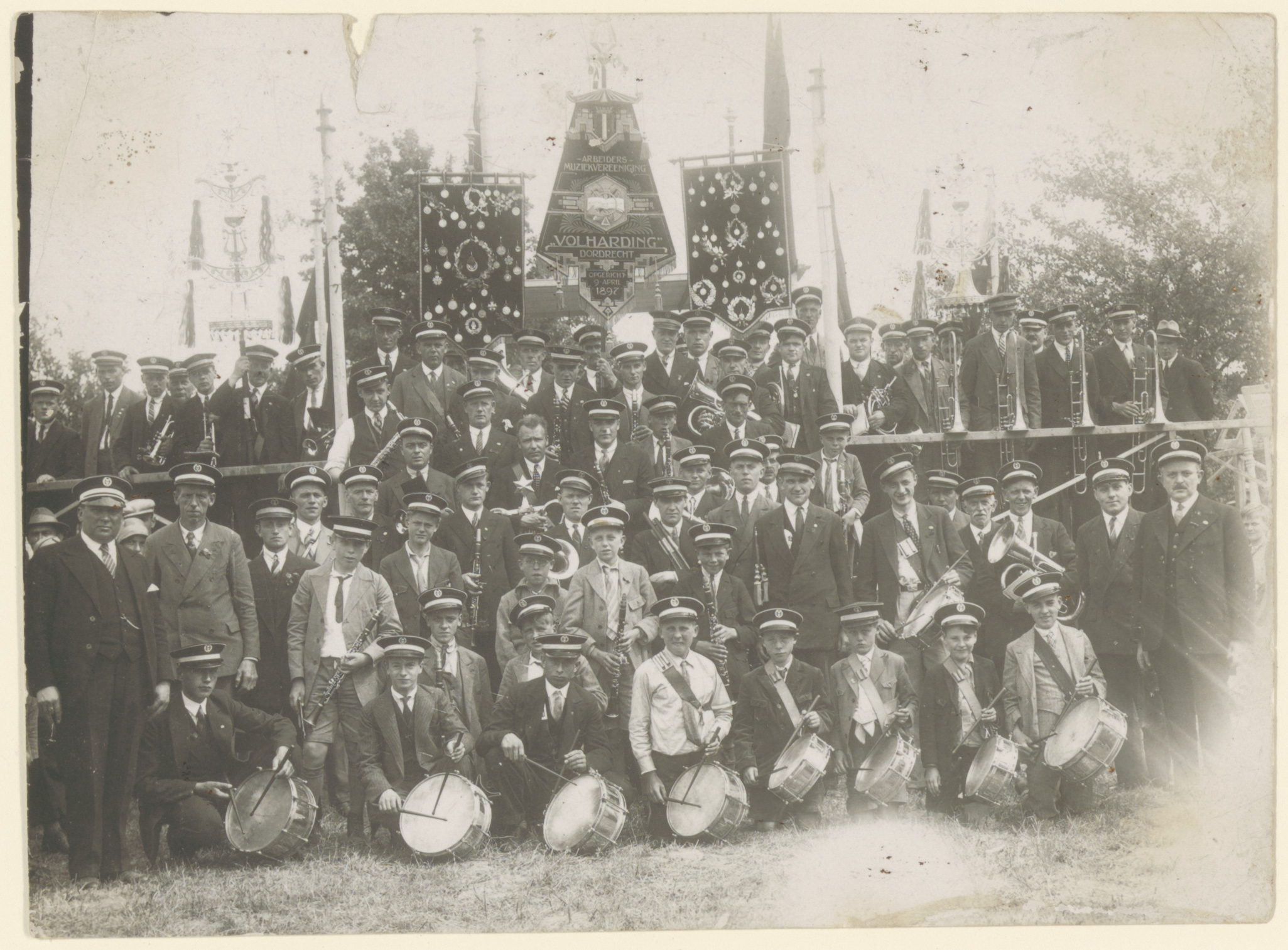 Groepsportret van Arbeidersmuziekvereniging Volharding, opgericht 9 april 1897. …