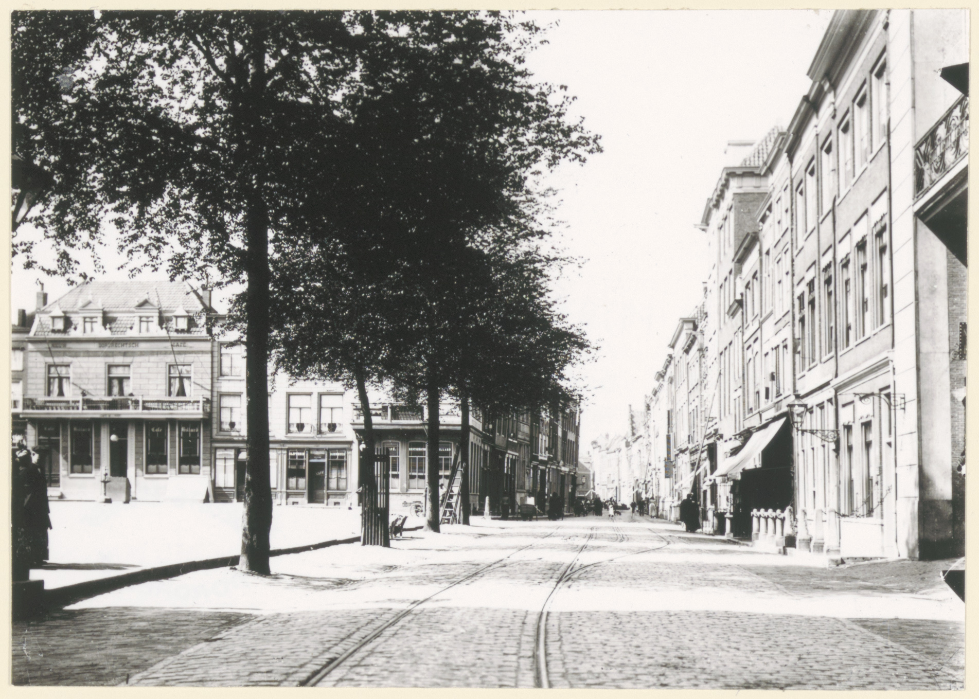 De Groenmarkt, gezien vanaf de Wijnstraat. Links het Scheffersplein. De rails zijn voor de paardentram.