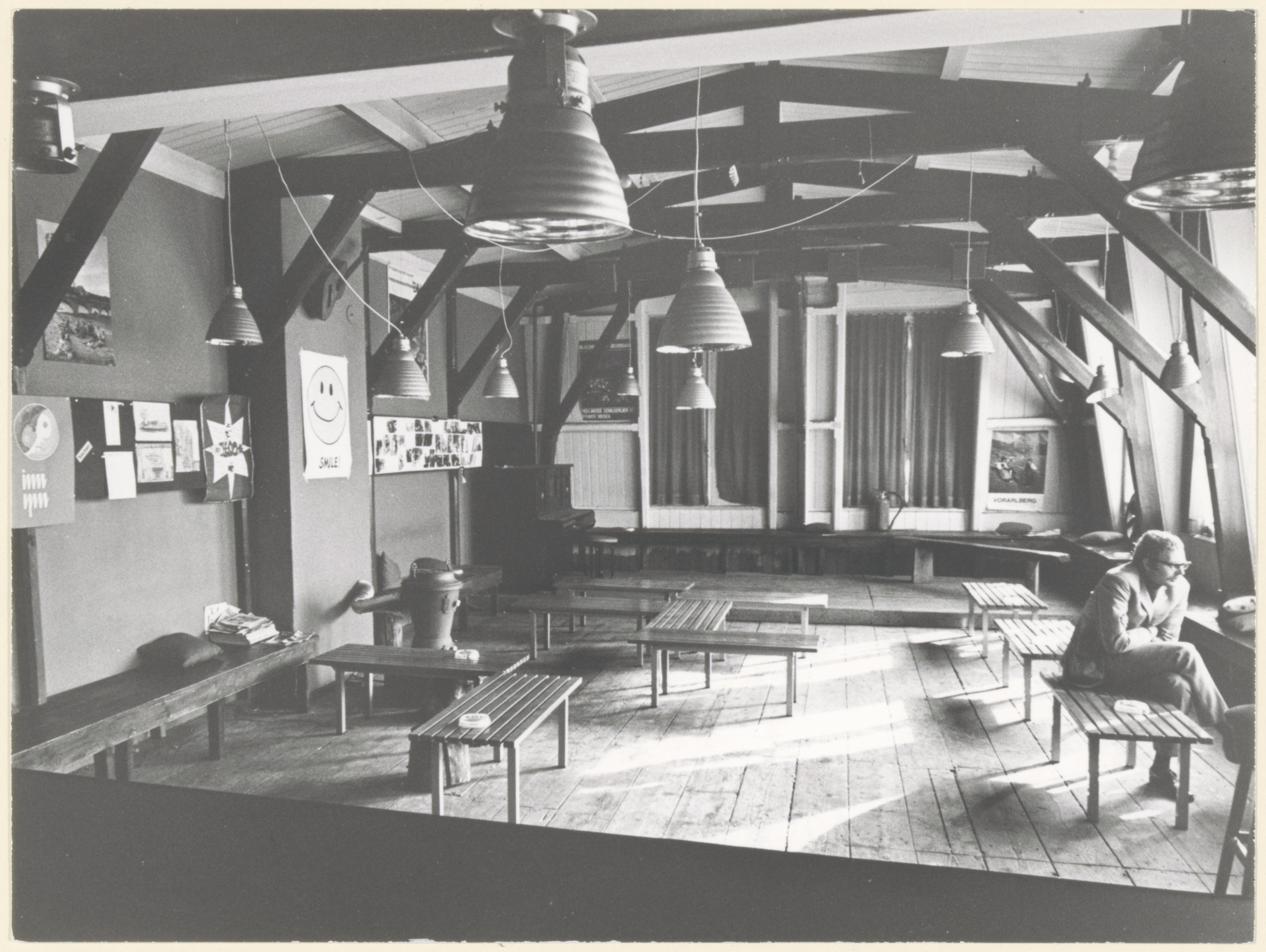 De zolder van het hoekhuis Grotekerksplein - Grotekerksbuurt, onderdak biedend aan sociëteit Yin voor jongeren van 20 tot 30 jaar. Rechts zit bestuurslid Rob Kooijman.