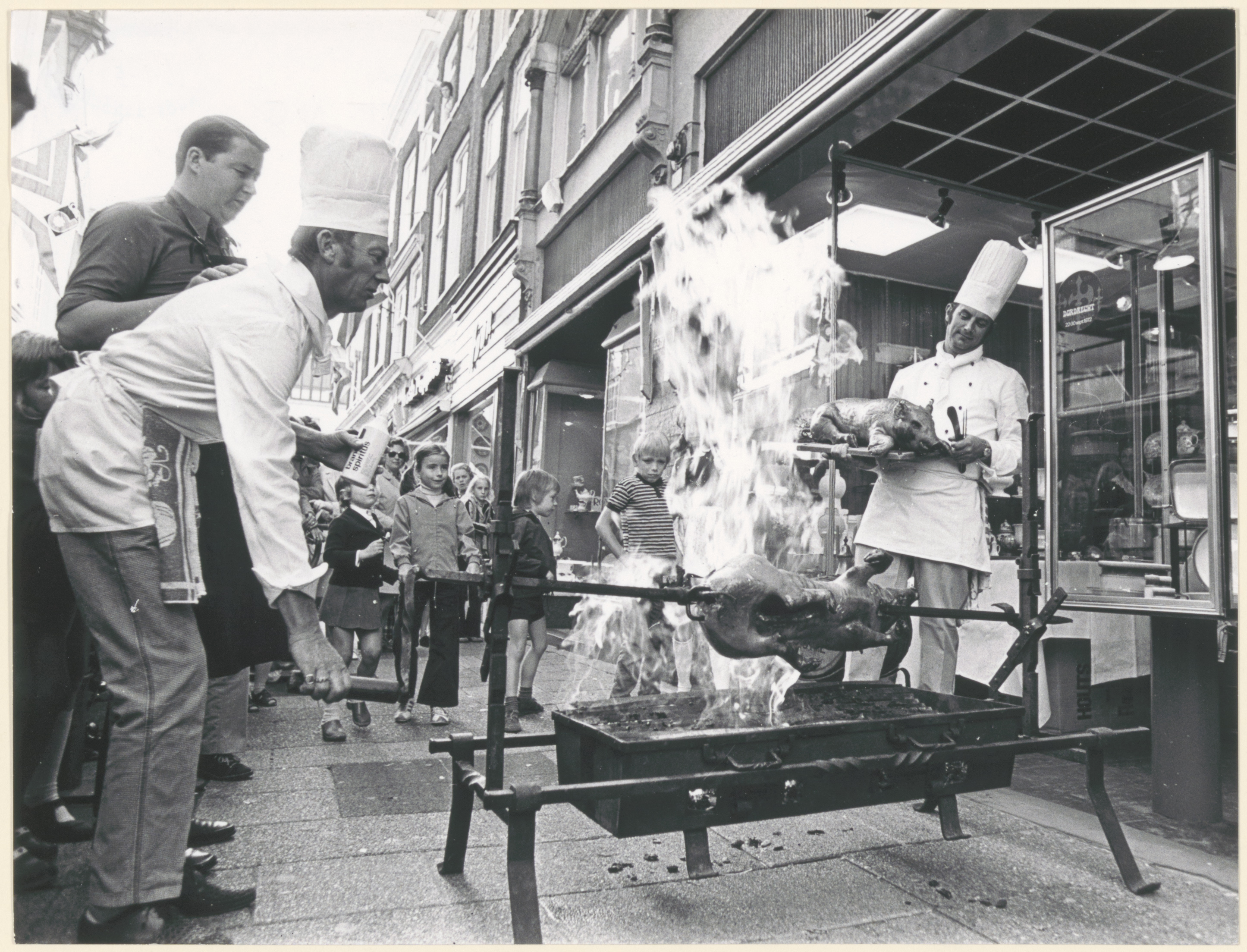 Het roosteren van een speenvarken op de Voorstraat tussen Scheffersplein en Visstraat …