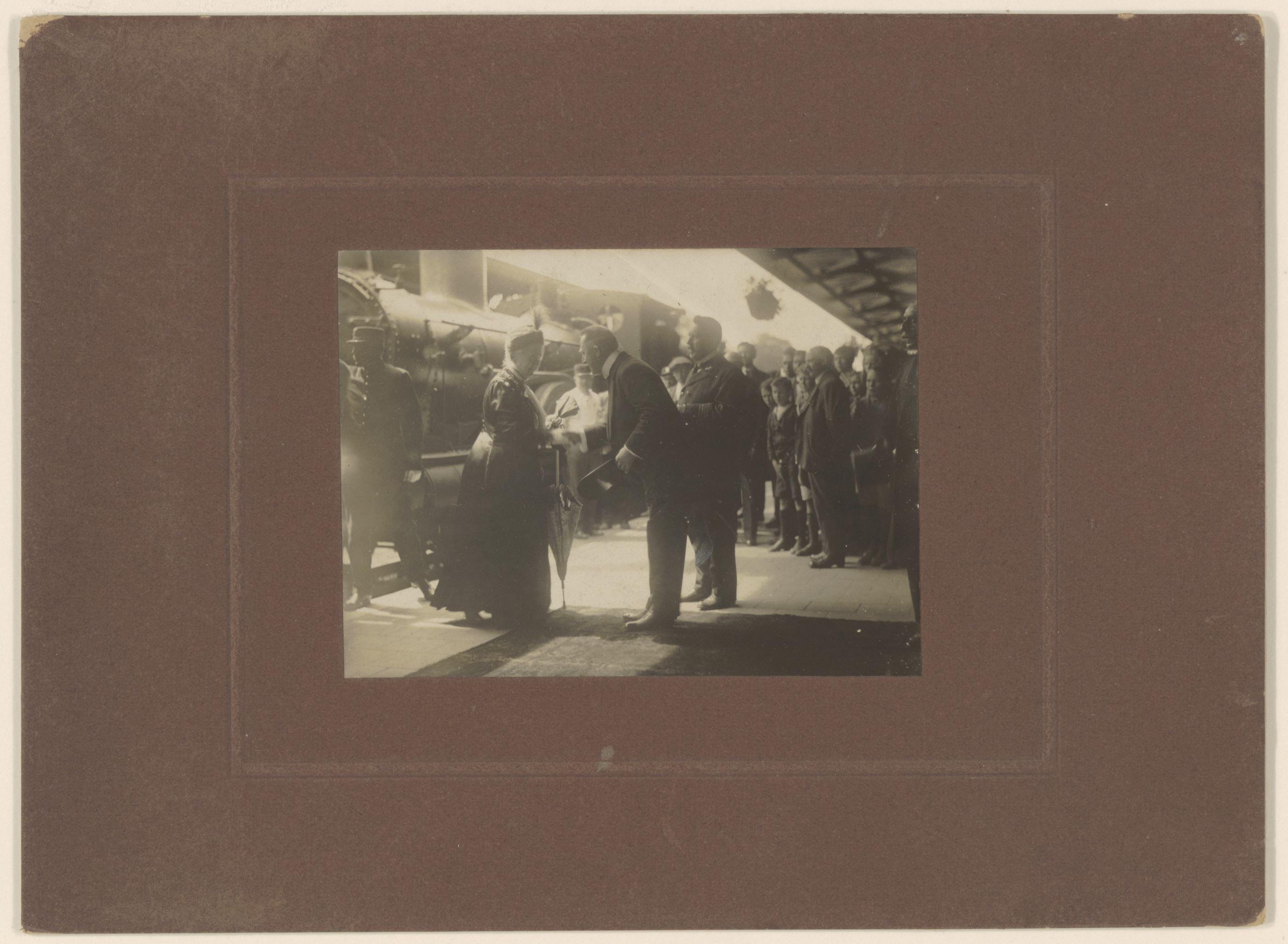 - Burgemeester mr. J.W. Wytema verwelkomt prinses Emma bij een bezoek op het station.