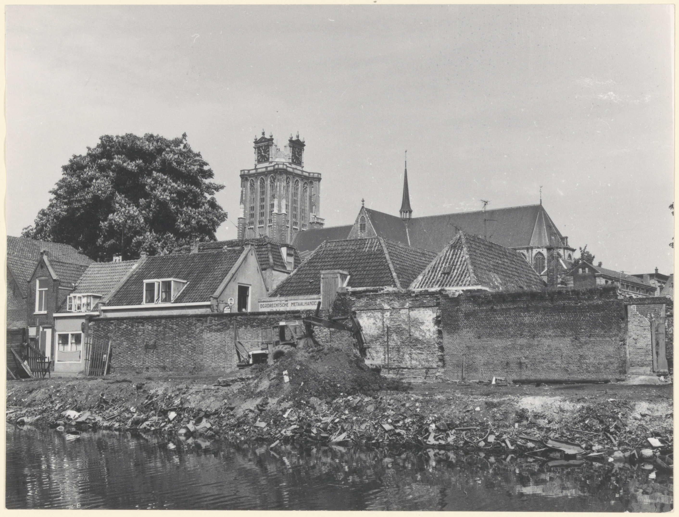 Sloopwerkzaamheden aan de Boogjes; een deel van de oude stadsmuur staat nog overeind. Op de achtergrond de Grote Kerk.