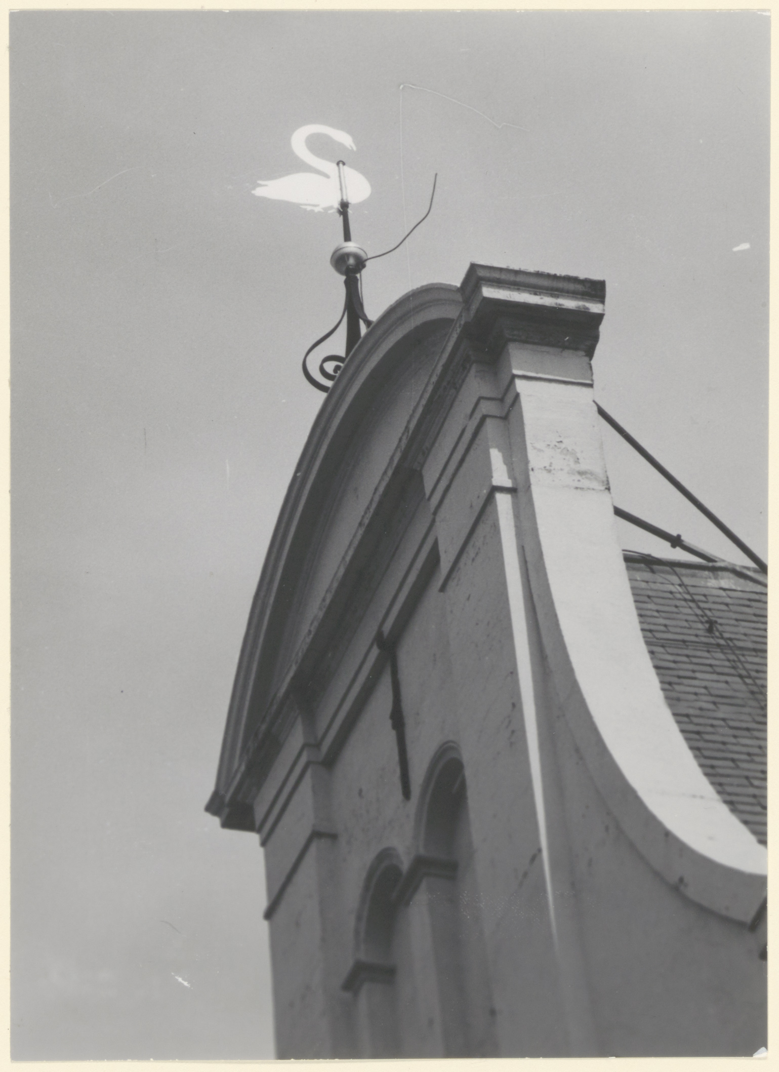 - Een zwaan als windwijzer op de Trinitatiskapel van de Evangelisch Lutherse Gemeente in de Vriesestraat.