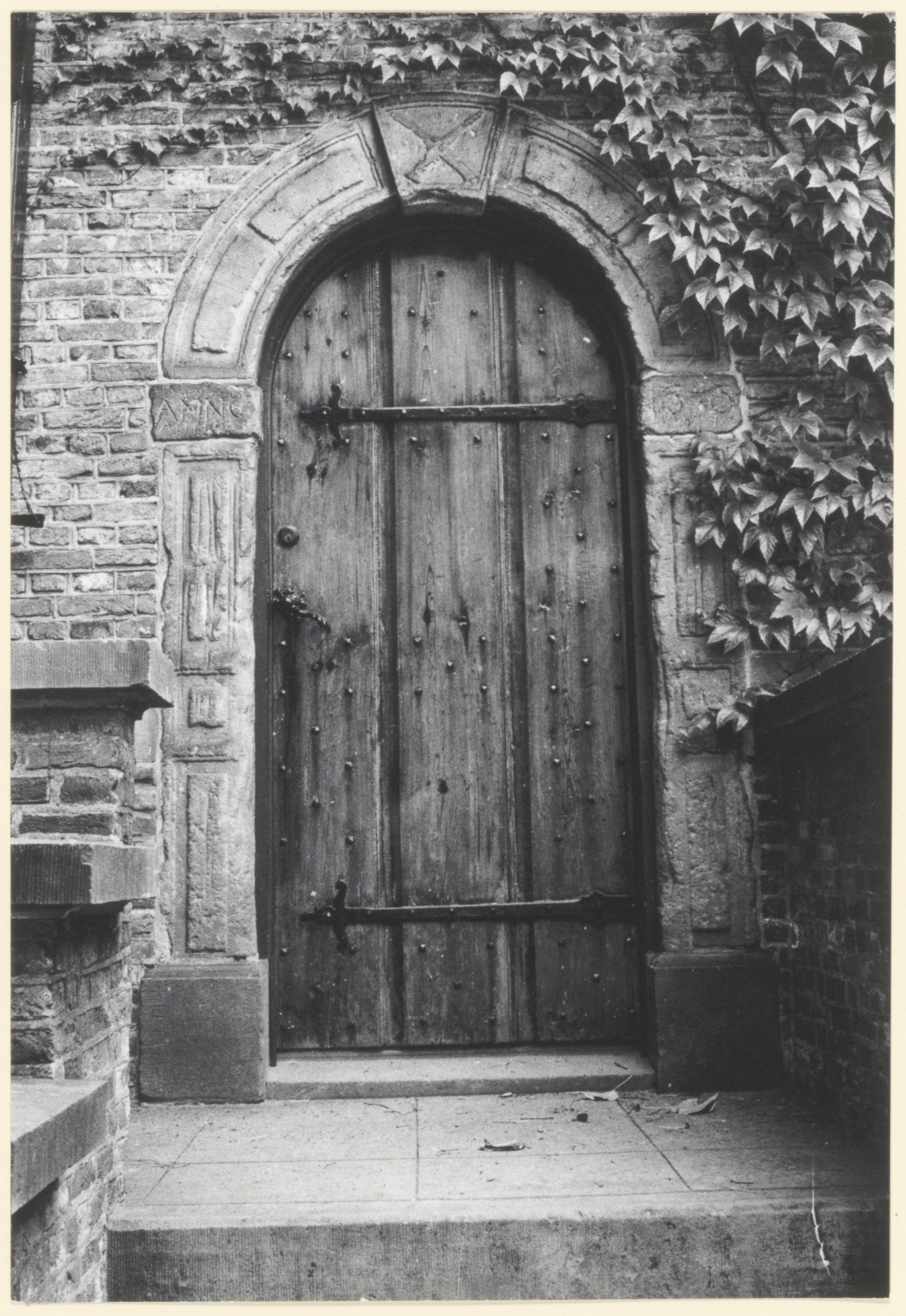 Een stenen poortje met houten deur in het huis Crabbehof nabij de Talmaweg; in de boog …