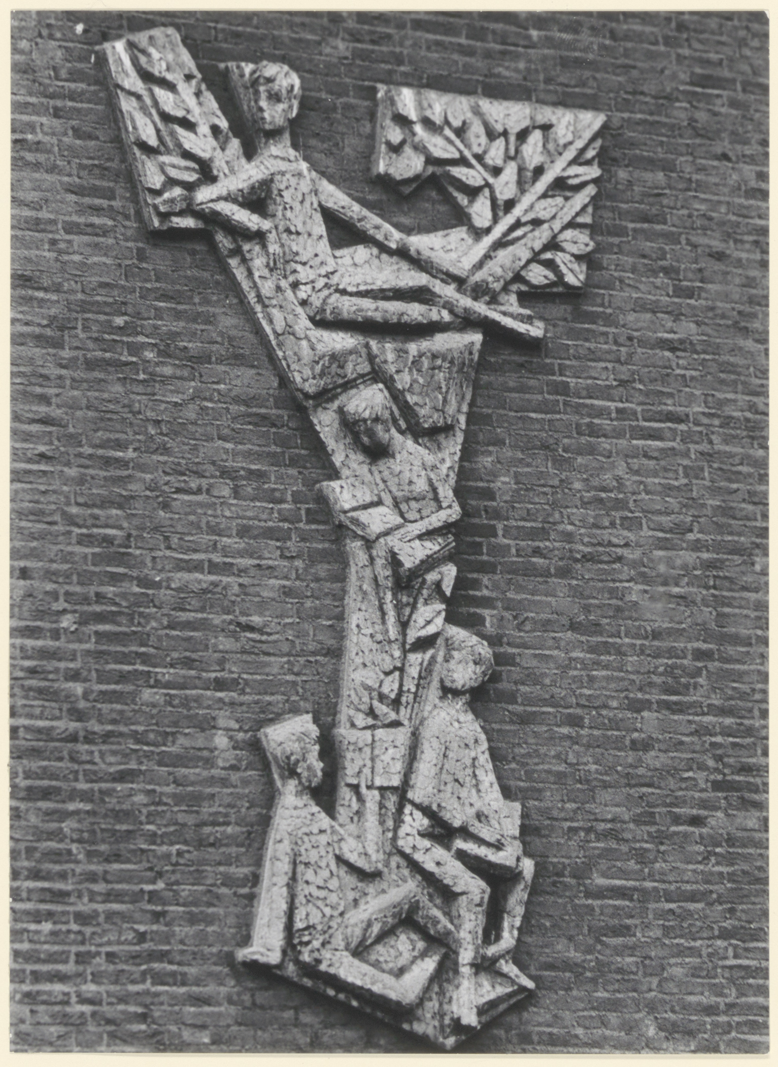 Een van de drie betonsculpturen van Toos Neger die in 1959 zijn aangebracht tegen drie …