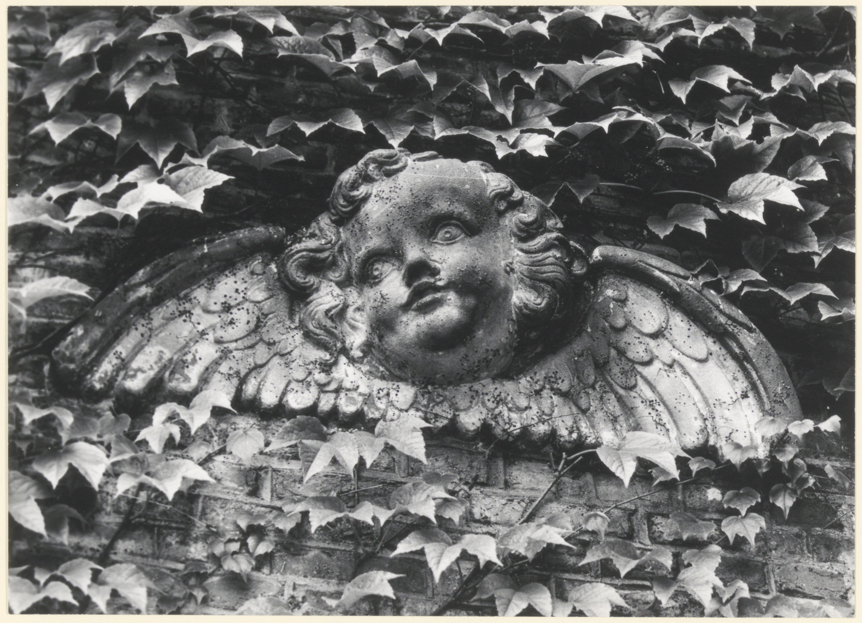 - Een puttokopje met vleugels tussen klimop aan de muur van kasteel Crabbehoff aan de Talmaweg.