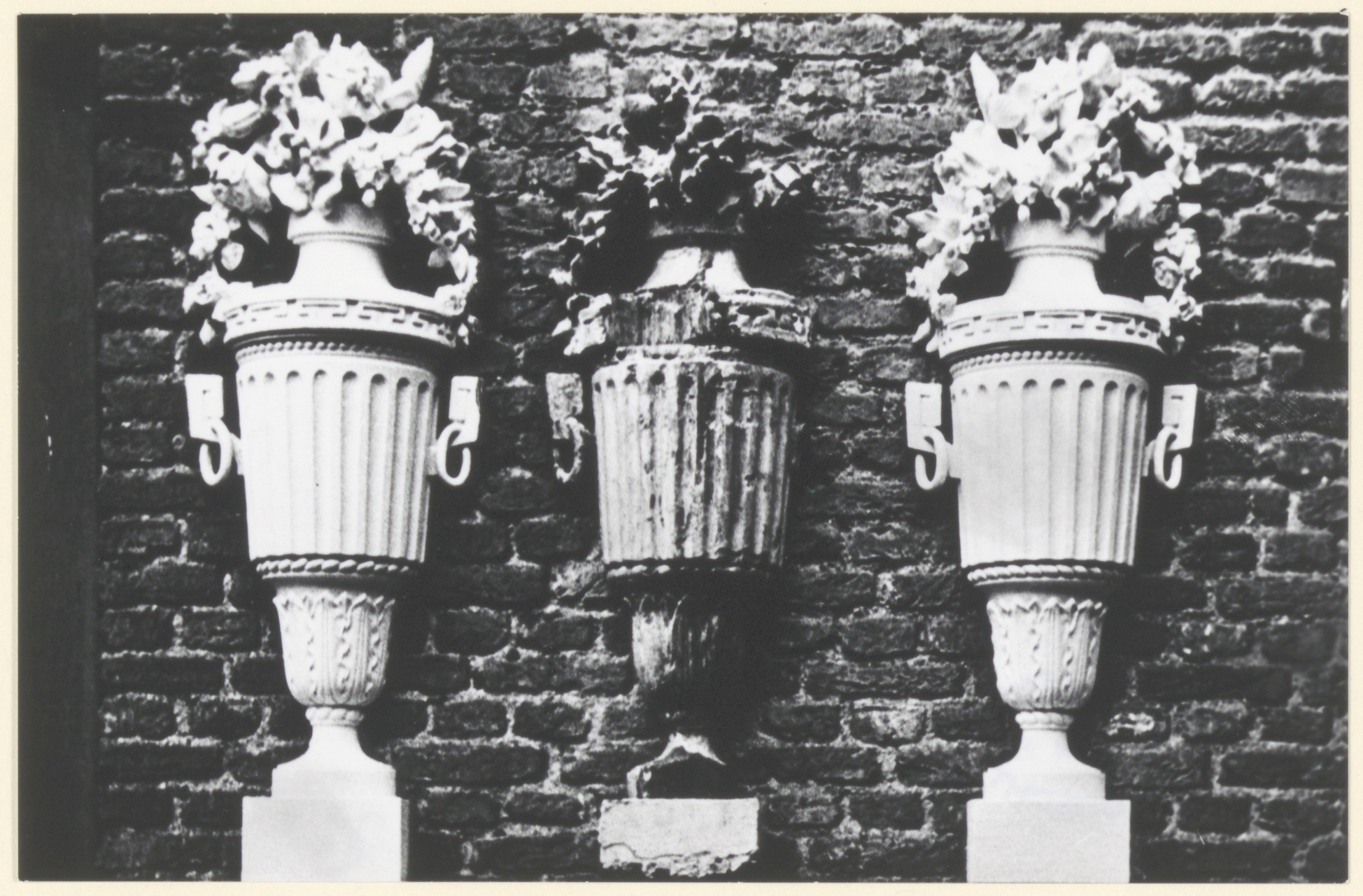 Drie stenen vazen met dito bloemen de middelste ouder, althans meer beschadigd, dan de buitenste, in/op een muur van het pand Houttuinen 2.