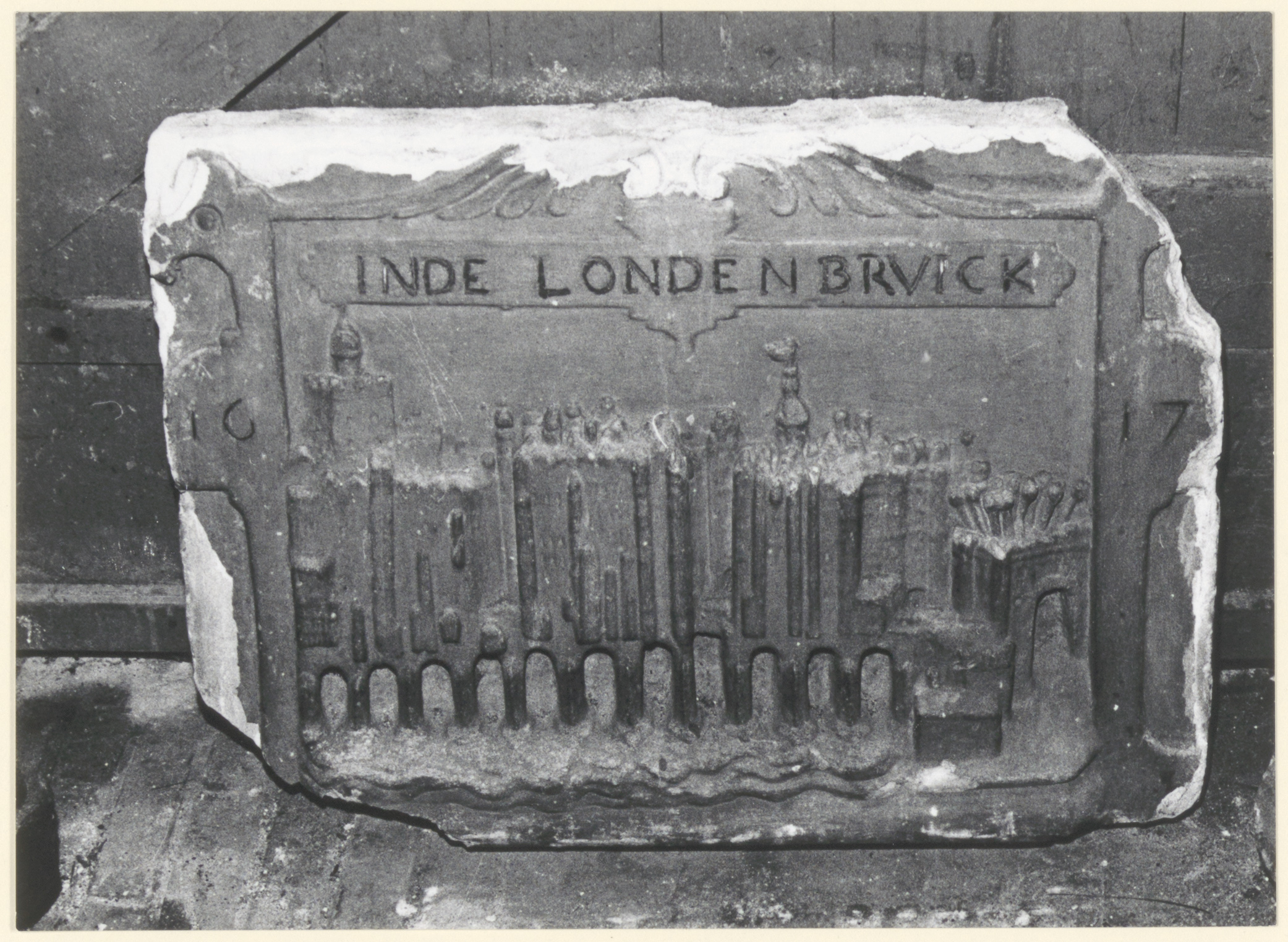 Gevelsteen van mergel met afbeelding van de Londonbridge over de Theems en opschrift …