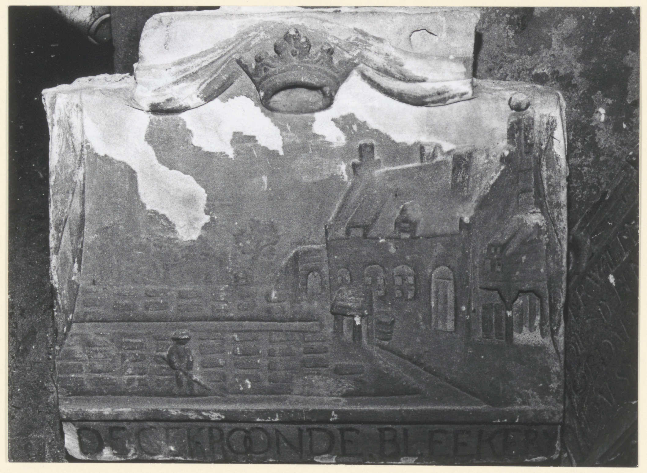 - Gevelsteen van zandsteen met afbeelding van een blekerij waarboven een kroontje en het onderschrift 'de gekroonde bleekery', volgens catalogus DI ook nog het jaartal 1644, afkomstig uit het gesloopte pand Steegoversloot 54 (oud nr.).